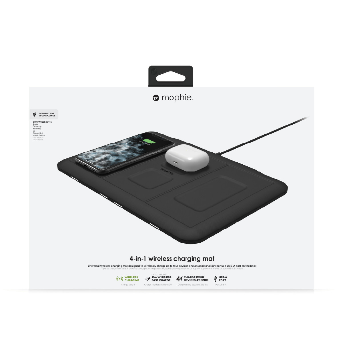 ĐẾ SẠC MOPHIE 4IN1 tích hợp công nghệ sạc không dây chuẩn Qi sạc an toàn và hiệu quả cho hầu hết các thiết bị: Apple, Samsung, Motorola, LG, các thiết bị hỗ trợ sạc Qi,...cho công suất lên tới 10W, cho phép sạc không dây tối đa lên tới 4 thiết bị cùng 1 lúc.