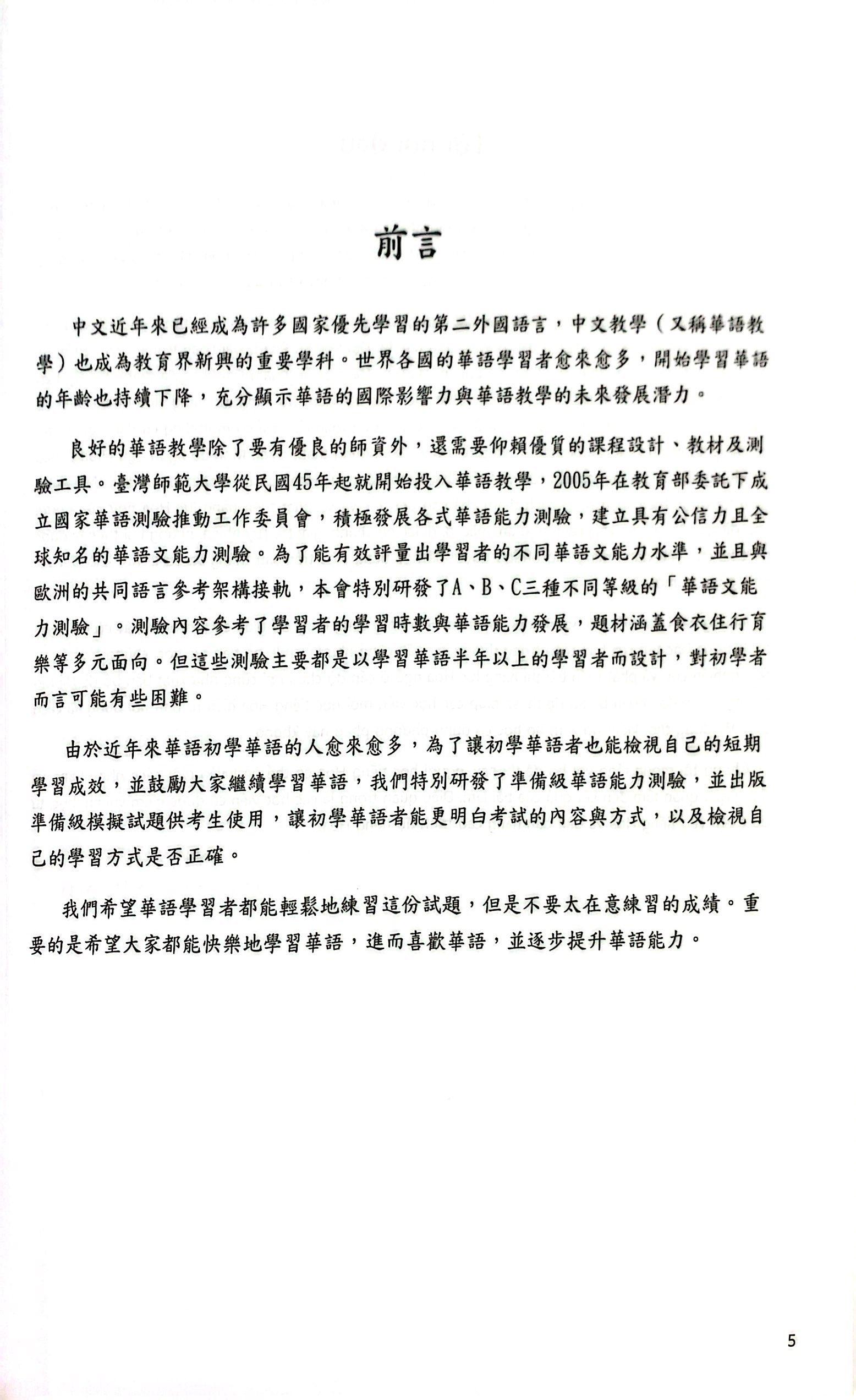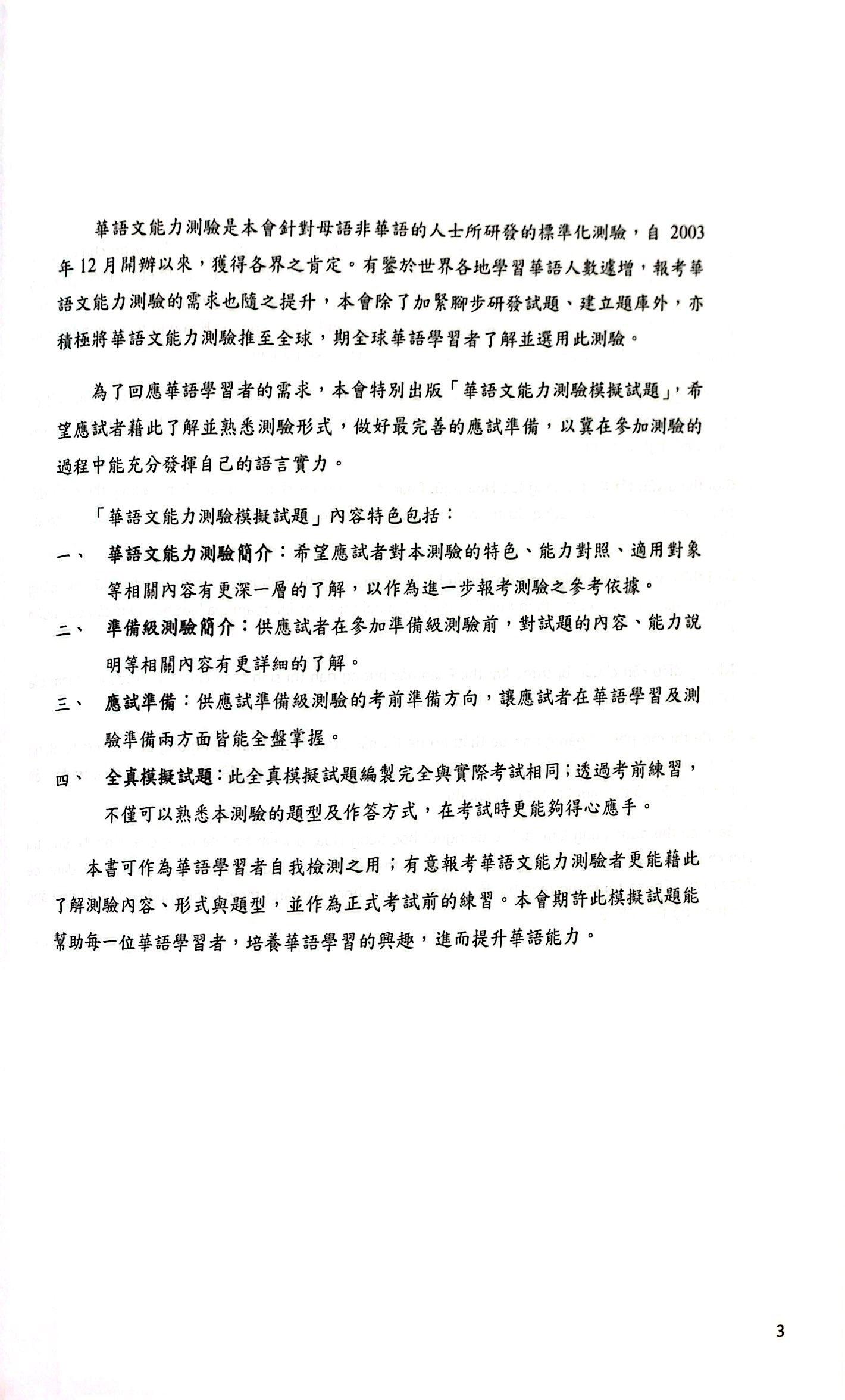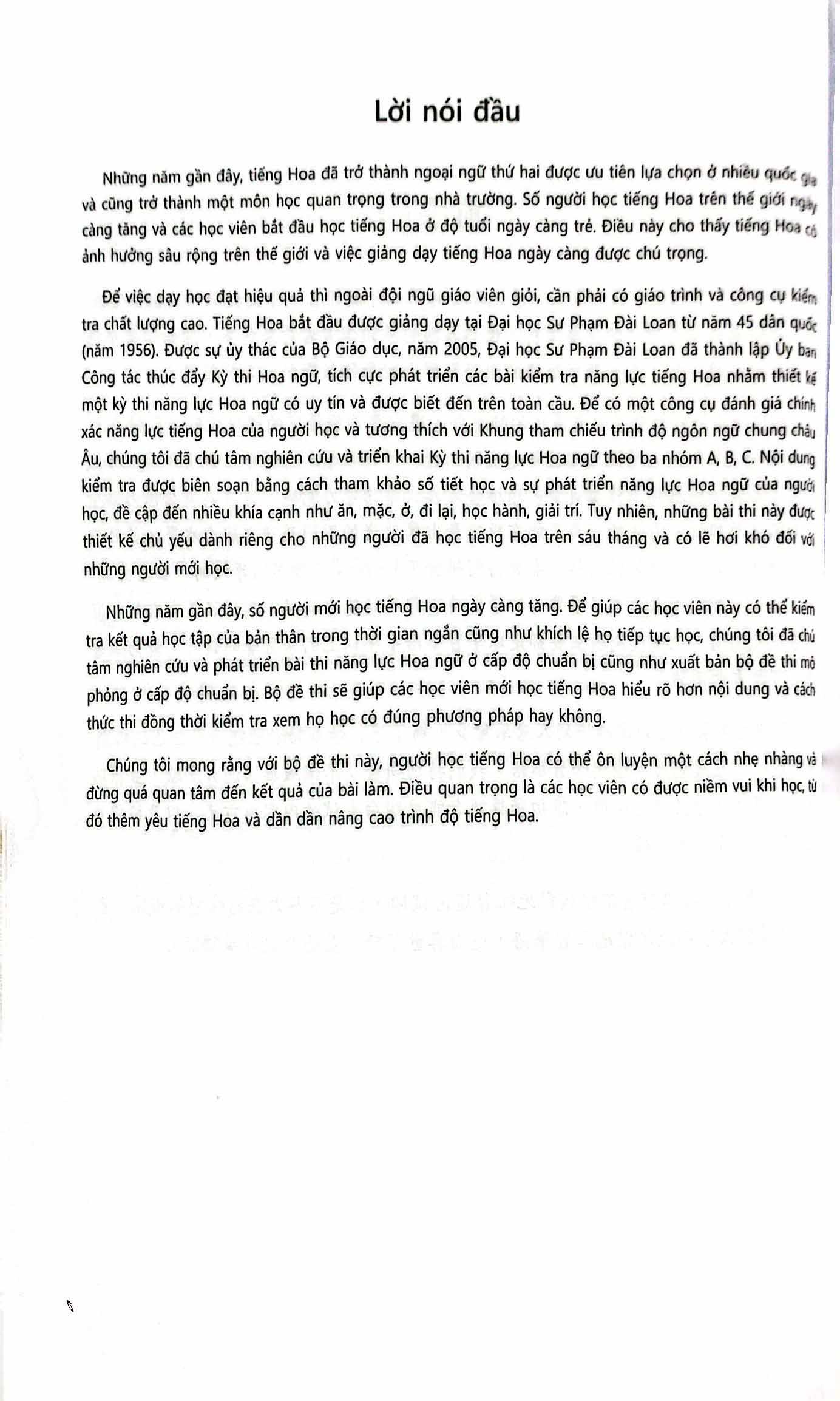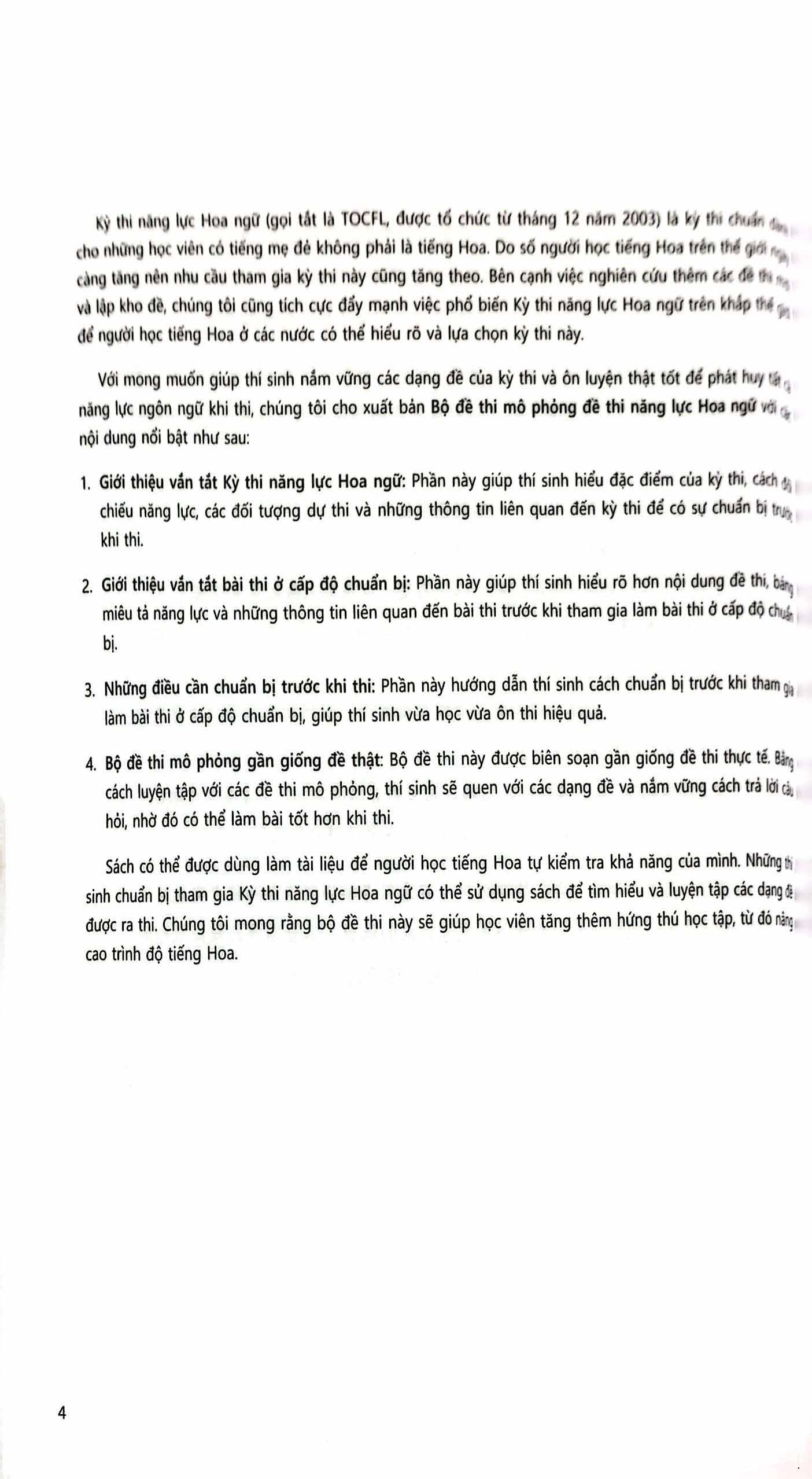 Những năm gần đây, số người mới học tiếng Hoa ngày càng tăng. Để giúp các học viên này có thể kiểm tra kết quả học tập của bản thân trong thời gian ngắn cũng như khích lệ họ tiếp tục học, chúng tôi đã chú tâm nghiên cứu và phát triển bài thi năng lực Hoa ngữ ở cấp độ chuẩn bị như xuất bản bộ đề thi mô phỏng ở cấp độ chuẩn bị. Bộ đề thi sẽ giúp các học viên mới học tiếng Hoa hiểu rõ hơn nội dung và cách thức thi đồng thời kiểm tra xem họ học có đúng phương pháp hay không.