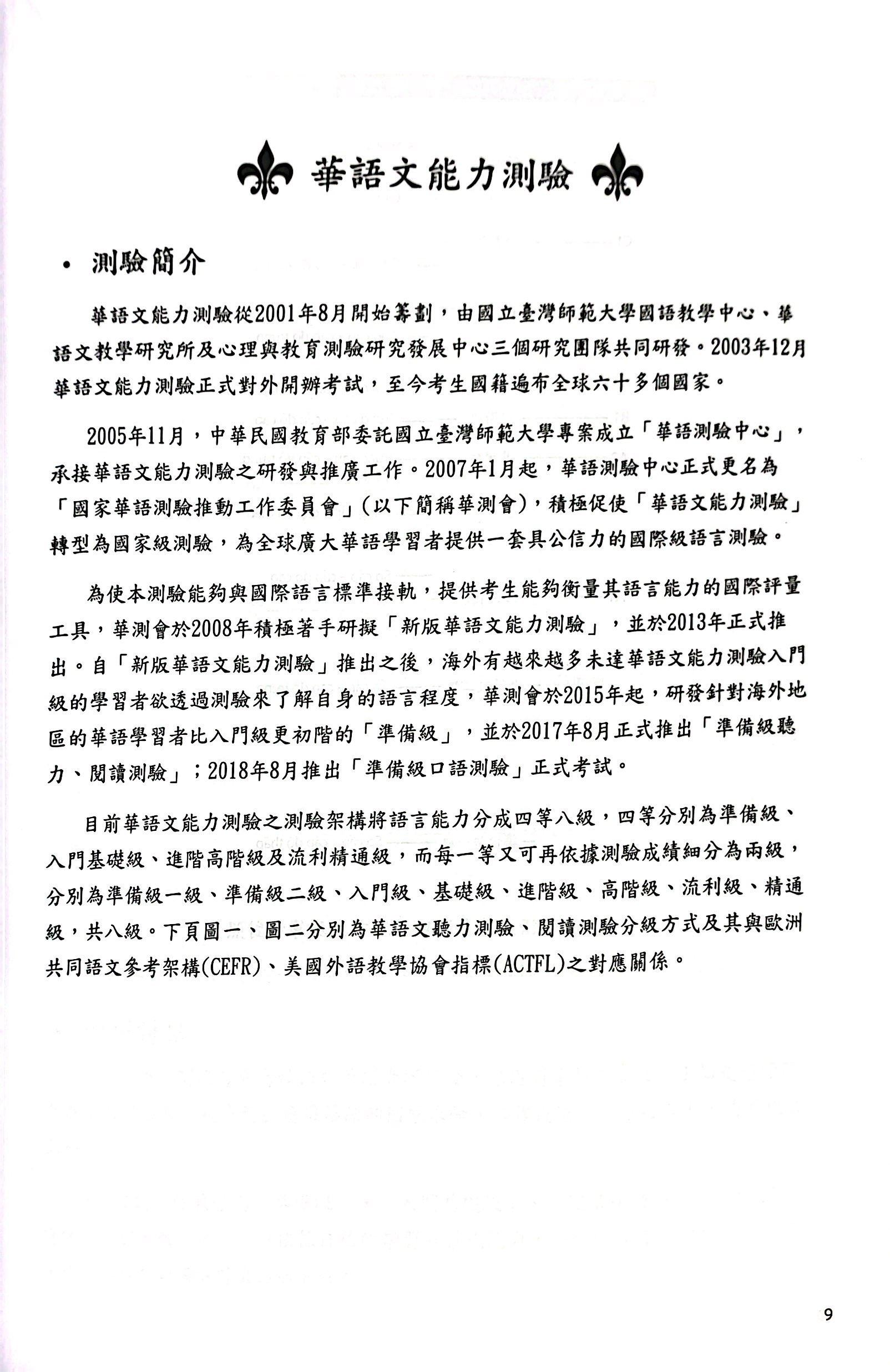 Để việc dạy học đạt hiệu quả thì ngoài đội ngũ giáo viên giỏi, cần phải có giáo trình và công cụ kiểm tra chất lượng cao. Tiếng Hoa bắt đầu được giảng dạy tại Đại học Sư phạm Đài Loan từ năm 45 dân quốc (năm 1956). Được sự ủy thác của Bộ Giáo dục, năm 2005, Đại học Sư Phạm Đài Loan đã thành lập Ủy ban Công tác thúc đẩy Kỳ thi Hoa ngữ, tích cực phát triển các bài kiểm tra năng lực tiếng Hoa nhằm thiết kế một kỳ thi năng lực Hoa ngữ có uy tín và được biết đến trên toàn cầu. Để có một công cụ đánh giá chính xác năng lực tiếng Hoa của người học và tương thích với Khung tham chiếu trình độ ngôn ngữ chung châu Âu, chúng tôi đã chú tâm nghiên cứu và triển khai Kỳ thi năng lực Hoa ngữ theo ba nhóm A, B, C. Nội dung kiểm tra được biên soạn bằng cách tham khảo số tiết học và sự phát triển năng lực Hoa ngữ của người học, đề cập đến nhiều khía cảnh như ăn, mặc, ở, đi lại, học hành, giải trí. Tuy nhiên, những bài thi này được thiết kế chủ yếu dành riêng cho những người đã học tiếng Hoa trên sáu tháng và có lẽ hơi khó đối với những người mới học.
