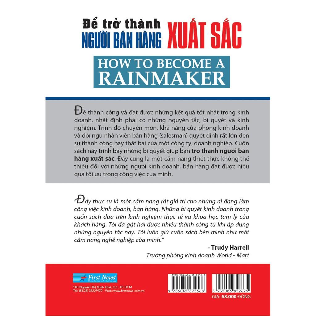 “Việc bán hàng giống như câu cá. Sự thành công của người bán hàng được thể hiện qua khối lượng cá của buổi đi câu.” và, “Người bán hàng xuất sắc không nói nhiều về bản thân mình, cũng không biện minh cho thất bại. Thay vào đó, họ luôn tập trung lắng nghe và tìm hiểu khách hàng.” First News trân trọng giới thiệu đến bạn đọc cuốn sách nổi tiếng Để Trở thành Người bán hàng Xuất sắc được biên dịch từ nguyên tác tiếng Anh How to Become a Rainmaker của tác giả Jeffrey J. Fox.