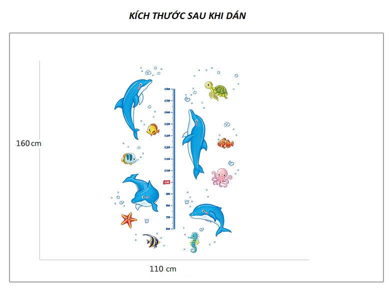 Decal dán tường thước đo Cá heo nhảy múa có màu sắc tươi sáng, vui nhộn. Decal với các hoạ tiết nhân vật hoạt hình, đem lại cảm giác như những người bạn thân thiết của bé ngay trong căn phòng xinh xắn của mình.
