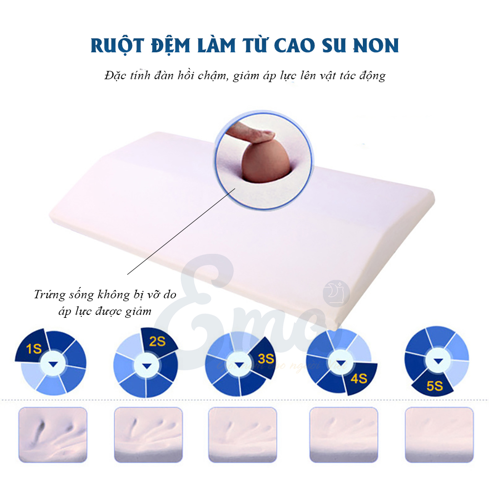 CÔNG DỤNG CỦA ĐỆM THẮT LƯNG EMA Đệm thắt lưng Ema giúp lấp đầy những khoảng trống của cơ thể được tạo ra khi bạn nằm ngủ: vùng eo, vùng khoeo chân. Các khoảng trống này được tạo ra theo đường cong cơ thể con người, khi nằm xuống sẽ khiến các vùng thắt lưng hay khoeo chân chịu các lực không bình thường Kê thắt lưng giảm đau cho các trường hợp bị tổn thương cột sống thắt lưng: người bị thoát vị đĩa đệm, thoái hóa đốt sống lưng, người cao tuổi bị các vấn đề xương khớ Kê thắt lưng cho bà bầu - đối tượng bị đau thắt lưng do sức nặng của bào thai gây nên Kê khoeo chân giảm căng cơ, tạo cảm giác thư giãn, thoải mái MÔ TA CHI TIẾT ĐỆM THẮT LƯNG EMA Thiết kế:  Đệm lưng Ema được thiết kế theo hình tam giác cân với chiều cao 4cm. Đây là thiết kế chuyên biệt giúp đệm lấp đầy khoảng trống ở dưới phần thắt lưng. Và tại sao điều này lại quan trọng đến thế? Đường cong sinh lý của cột sống là đường cong cột sống ở người bình thường. Ở người bình thường thì khi nhìn cột sống từ bên thì cột sống uốn cong theo đường cong cơ thể, hơi cong về phía trước ở phần cột sống thắt lưng. Chính điều này làm cho khi ngủ (đặc biệt khi nằm nghiêng) sẽ tạo ra khe hở, cột sống thắt lưng ở trạng thái treo cong. Đối với những người thường xuyên mang vác vật nặng, làm việc cúi người hoặc người thoát vị đĩa đệm tư thế này sẽ gây đau, mỏi vùng thắt lưng Ảnh minh họa: Đệm giúp nâng đỡ thắt lưng từ đó giữ cột sống cong theo đường cong sinh lý tự nhiên Đệm thắt lưng Ema với thiết kế theo công thái học cột sống giúp người sử dụng "lấp đầy" vùng hẫng này, từ đó giải phóng áp lực lên cột sống thắt lưng, giúp cột sống luôn theo đường cong sinh lý của cơ thể (trạng thái tự nhiên nhất) Điểm nổi bật:  Không giống như các loại gối đệm thắt lưng thông thường, đệm thắt lưng Ema có chiều rộng vượt trội giúp người sử dụng xoay trở thoải mái khi nằm. Từ đó giúp người sử dụng thư giãn, không phải chịu các cơn đău thắt lưng, thoải mái xoay trở dù nằm ngửa hay nằm nghiêng.  Kích thước: Dài 24cm - vừa khít vào vùng thắt lưng. Rộng 60cm - rộng hơn tất các các loại gối, đệm thắt lưng truyền thống giúp người dùng thoải mái xoay trở, không sợ bị trượt ra khỏi gối. Cao 4cm - chiều cao tiêu chuẩn phù hợp với vóc dáng người Việt, vừa khít vào vùng cong của thắt lưng Vỏ gối: Gối được thiết kế gồm 2 lớp vỏ có khóa kéo giúp tiện lợi trong việc tháo giặt vệ sinh. Vỏ ngoài được làm từ vải nhung co giãn 4 chiều, trên mặt có hàng trăm lỗ nhỏ giúp điều hòa không khí. Vỏ lót móng hơn được làm từ vải mắt chim siêu thoáng Ruột gối: Được làm từ 100% cao su non với đặc tính đàn hồi chậm, giúp lấp đầy một cách êm ái vùng thắt lưng khi bạn nằm lên, từ đó giảm áp lực và giảm đau lên khu vực này.  Memory Foam (cao su non) với đặc tính chậm đàn hồi là vật liệu do trung tâm vũ trụ NASA phát minh vào năm 1966 nhằm nâng cao sự an toàn cho các phần nệm của thiết bị bay nhằm giảm thiểu tối đa áp lực tác động lên các phi hành gia và rung chấn trong quá trình phóng tàu vũ trụ. Ngày này chất liệu này được sử dụng rất nhiều trong ngành công nghiệp gối - đệm   Ảnh minh họa: Dùng trứng sống ấn lên đệm - trứng không hề vỡ do đệm đã phân tán gần hết áp lực gây ra Ảnh thực tế sản phẩm: Màu sắc: gối có 2 màu trung tính phù hợp với cả nam, nữ tất cả các độ tuổi là Xanh và Xám