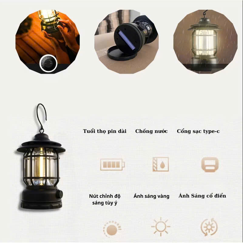 • Ánh Sáng Vàng Ấm Áp, Trang Trí Đẹp Mắt: Đèn phát ra ánh sáng vàng dịu nhẹ, tạo không gian ấm cúng và dễ chịu, rất thích hợp cho việc trang trí và tạo không khí thoải mái trong các buổi tiệc, cắm trại hay các hoạt động ngoài trời vào ban đêm. Ánh sáng vàng không chỉ giúp chiếu sáng mà còn làm tăng vẻ đẹp cho không gian của bạn.