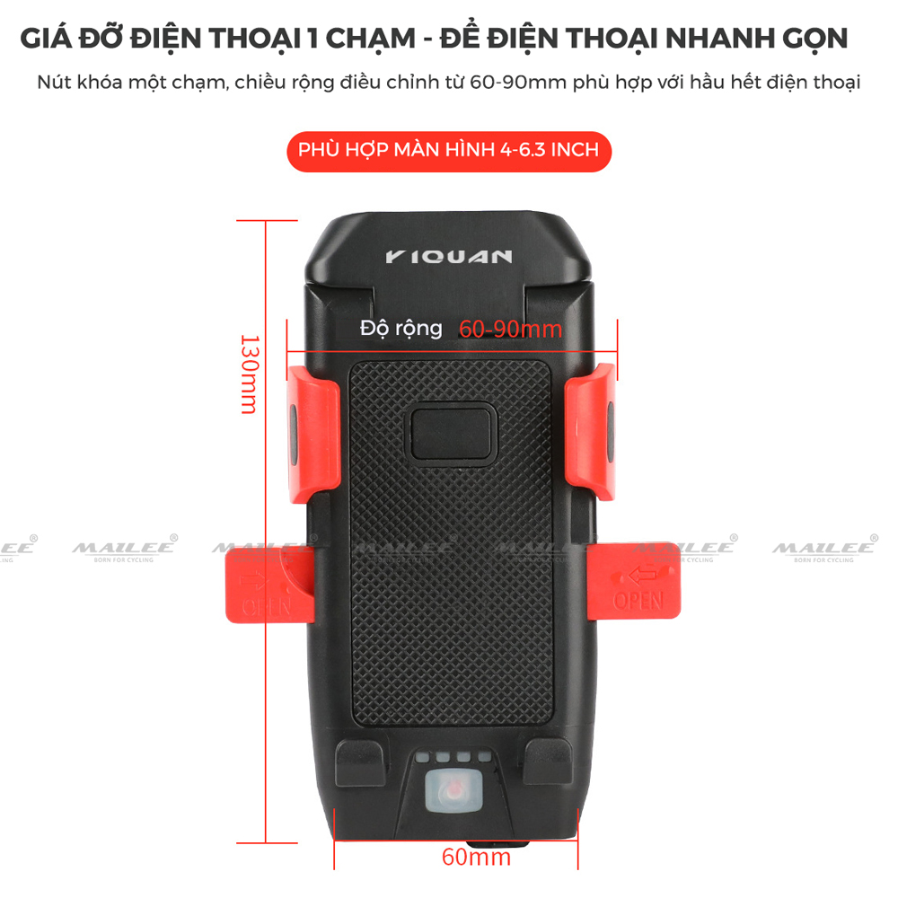 Đèn Xe Đạp 4in1, thiết bị đa năng với giá đỡ điện thoại 4-6.3 inch (khóa 1 chạm), còi 130dB, đèn 500 lumens, và pin sạc 3000mAh. Thiết kế nhỏ gọn, sạc USB, phù hợp đạp xe ban đêm và đường trường.