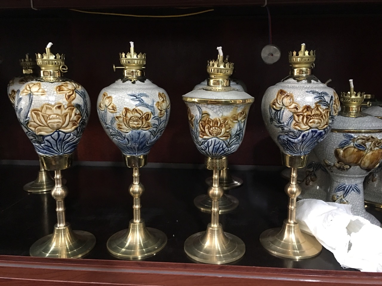 Đèn dầu bàn thờ gốm sứ Bát Tràng – Đồ thờ cúng – Hoa sen men lam cao cấp