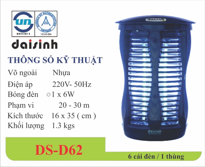 Mô tả sản phẩm Đèn Diệt Côn Trùng Đại Sinh DS-D62 (xanh)Tặng 1 đèn ngủ cảm ứng ánh sáng hình ly - Đèn diệt côn trùng bằng lưới điện. - Vỏ ngoài: Nhựa - Khung