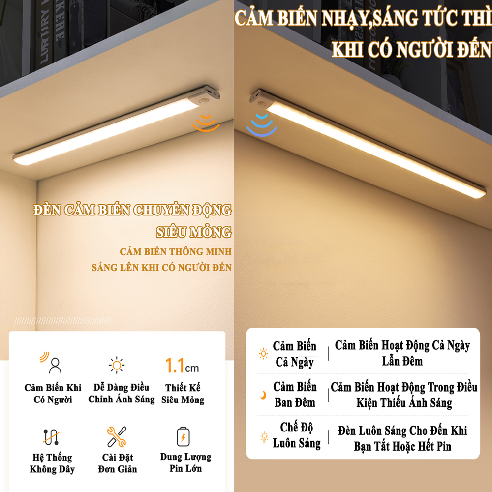 - THÔNG TIN SẢN PHẨM - Chất Liệu: Nhôm + PC + ABS - Màu Sắc: Đen, Bạc - Màu Sắc Ánh Sáng: Ấm(3000K), Tự Nhiên(4000K), Trắng(6000K) - Chế Độ: Cảm Biến Cả Ngày, Cảm Biến Ban Đêm, Chế Độ Luôn Sáng - Thời Gian Sạc: ~ 2h - Bộ Sản Phẩm Gồm: Đèn, 2 Miếng Dính Từ Tính, Cáp Sạc Micro USB. - Kích Thước: Xem Chi Tiết Trên Ảnh - Trọng Lượng: 32g/55g/77g/102g/145g ~ 10/20/30/40/60 cm