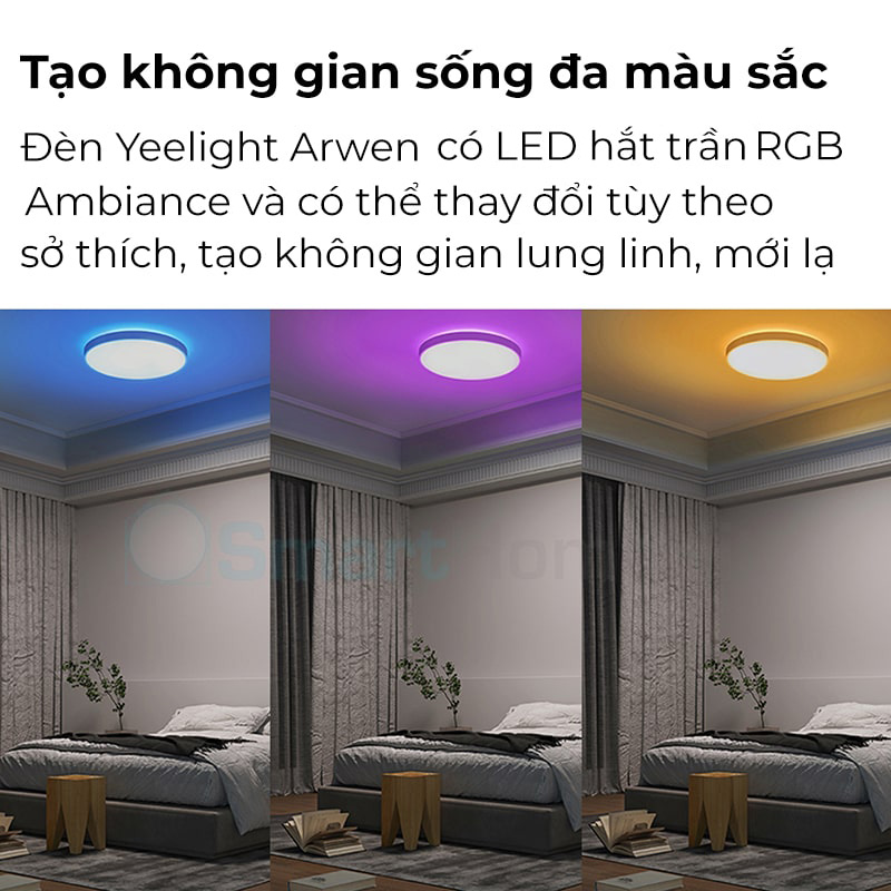 - Đèn đã bao gồm 1 Yeelight Remote Bluetooth Đèn thông minh Yeelight – Nguồn ánh sáng chất lượng cao cho cả gia đình Đèn trần Yeelight Arwen C có hai kích thước: φ495mm và φ599mm phù hợp với phòng 15-25㎡ và 20-30㎡. Viền đèn được bo cong mềm mại dành cho những ai đề cao tính thẩm mỹ nhẹ nhàng. Phía sau đèn là dải đèn LED Ambiance RGB. Cả hai phần đèn đều có thể thay đổi độ sáng và màu sắc bằng app Yeelight. Đèn Yeelight Arwen C có công suất 50W, đủ chiếu sáng cho mọi hoạt động trong nhà. Đa dạng khả năng điều khiển Đèn ốp trần Yeelight Arwen có thể điều khiển thông qua ứng dụng Yeelight. Đèn có thể tùy chỉnh độ sáng từ 0-100% từ màu vàng . Kết hợp cùng các nền tảng Smart Home như Google Gome hay Alexa và điều khiển bằng giọng nói: