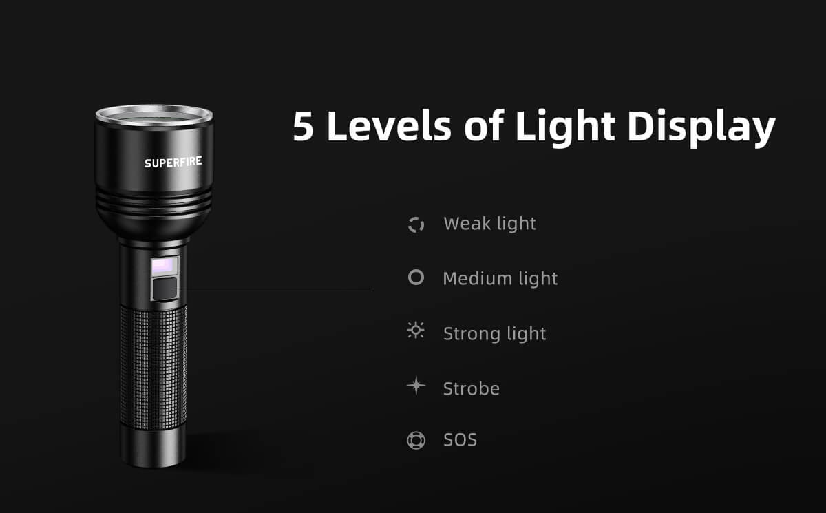 Superfire D18 có 5 chức năng chiếu sáng tiêu chuẩn : Sáng mạnh/TRung bình/Yếu/Nhấp nháy/SOS
