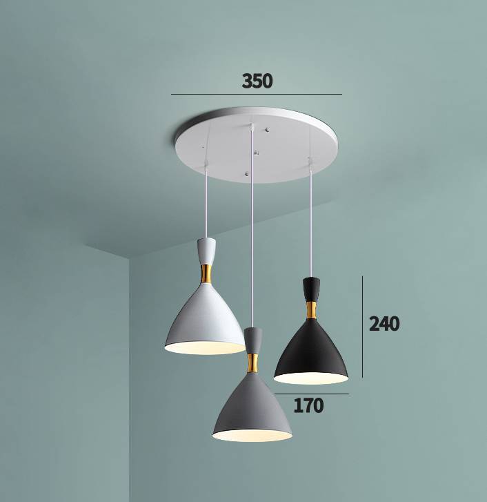 Chất liệu: Đế bằng hợp kim đen sơn tĩnh điện,chao là kim loại sơn tĩnh điện mầu hồng,xanh dương,xanh lá,vàng,đen,trắng,ghi *Đui e á chưa bao gồm bóng * Kích thước: φ150 * Chiều dài dây