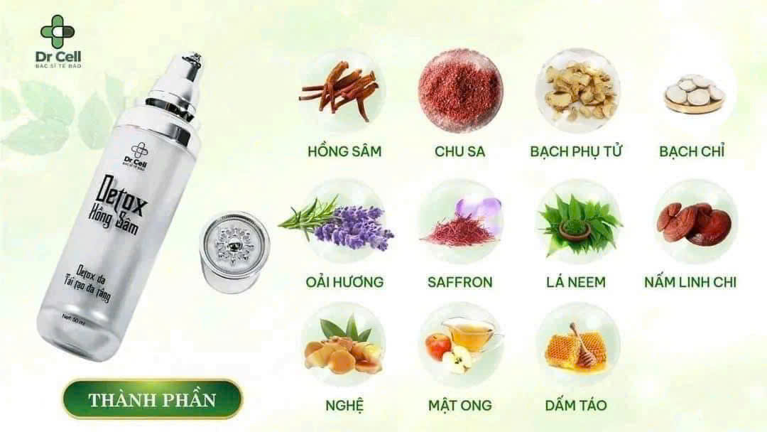 Detox Hồng Sâm Dr Cell 50ml   THÀNH PHẦN: Aqua, Huyết sâm, chu sa, bạch phụ tử, bạch chỉ , oải hương, nhuỵ hoa, nghệ tây , lá nêm, nấm linh chi, dầu tràm , nghệ, mật ong, dấm táo.   CÔNG DỤNG: - Detox thải độc da. - Đào thải cặn bã và độc tố dưới tầng da. - Tái tạo đa tầng. - Hỗ trợ se chân lông. - Hỗ trợ tăng sinh tế bào da mới sáng hồng. - Giảm mụn. - Giúp tăng tế bào hỗ trợ cải thiện sẹo rỗ   CÁCH DÙNG: Lắc đều sản phẩm sau đó thoa trực tiếp lên vùng da cần tái tạo. 3 ngày đầu thoa 1 lần/ngày, sau đó tăng dần lên 2-3 lần/ngày. Sau 2-3 tuần sử dụng, kết hợp lấy nhân mụn đối với các trường hợp mụn nặng để rút ngắn thời gian đtri. Khi da bắt đầu bong vẫn tiếp tục sử dụng liều dưỡng cho đến khi hết mụn, thâm hoặc nám. Khi cảm thấy da đã đẹp, đợi bong lớp da cuối cùng để kết thúc liệu trình và chuyến qua dưỡng da.