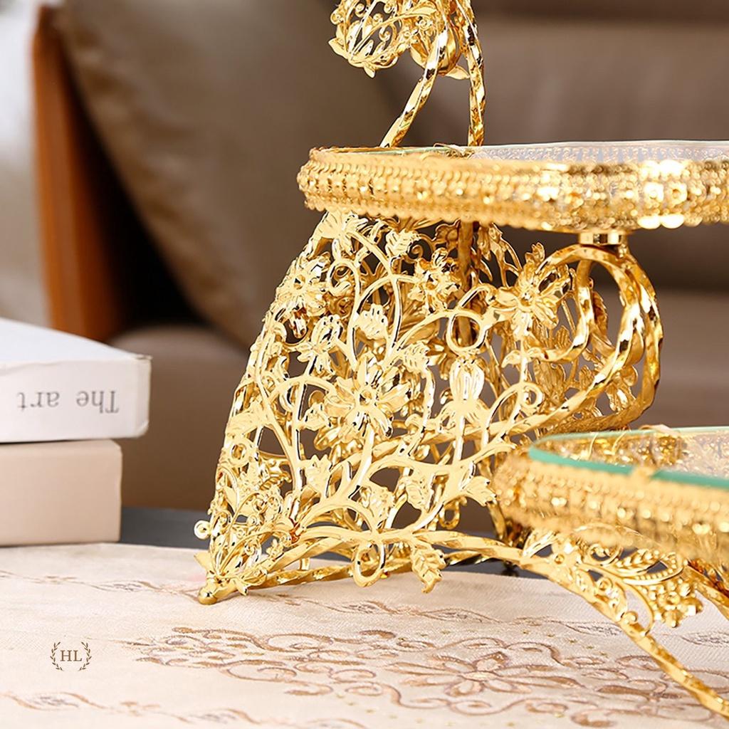 Đĩa 3 tầng khảm đá Hoàng Gia hình tầng lệch Chất liệu: Hợp kim đồng mạ tĩnh điện không bay màu Sử dụng chất liệu kính Triplex cường lực Toàn bộ đính đá Swarovski Chất liệu: hợp kim mạ PVD Kích thước: 30 * 50 cm