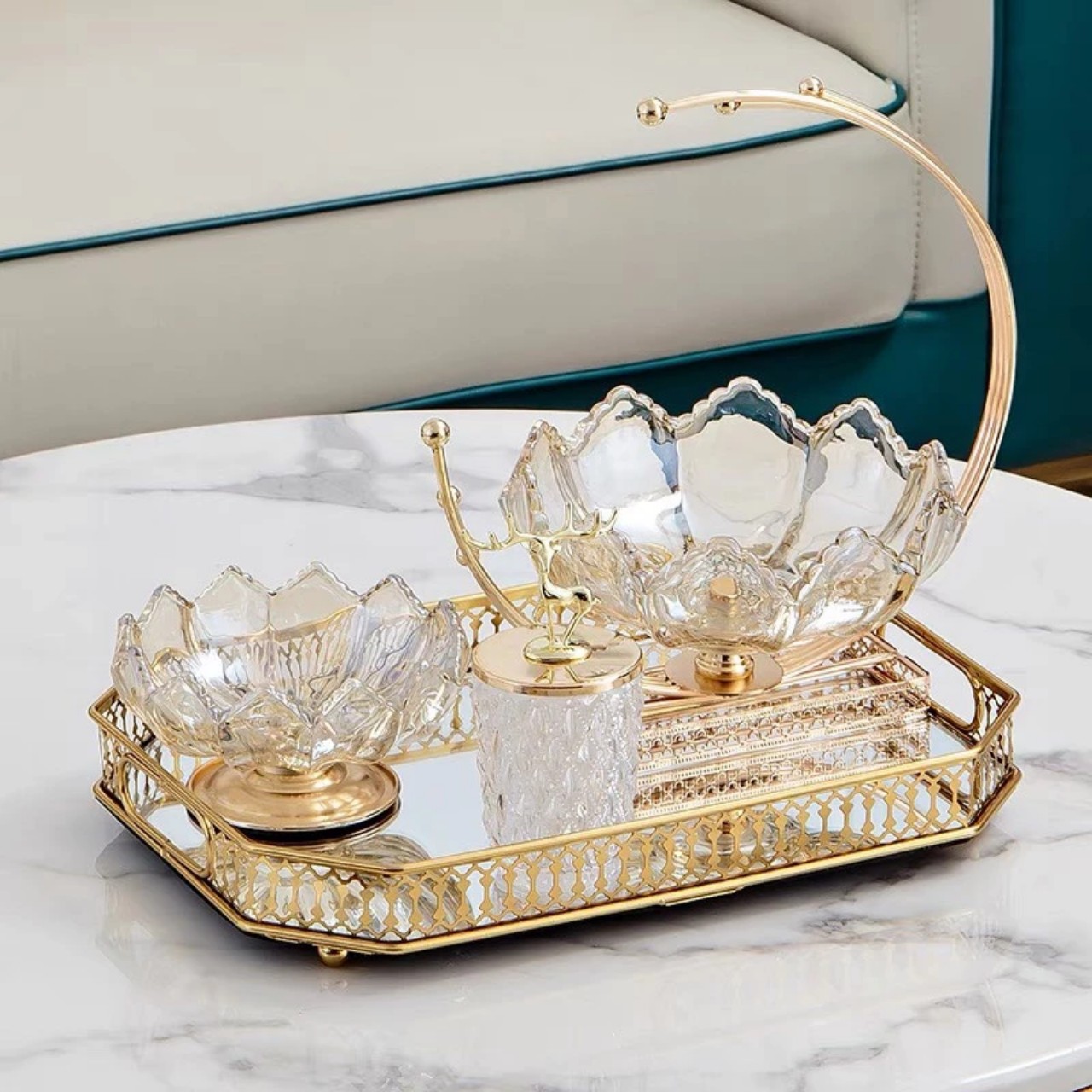 Bộ khay Mứt Tết và 6 hũ thủy tinh đựng bánh kẹo hạt kim loại mạ vàng