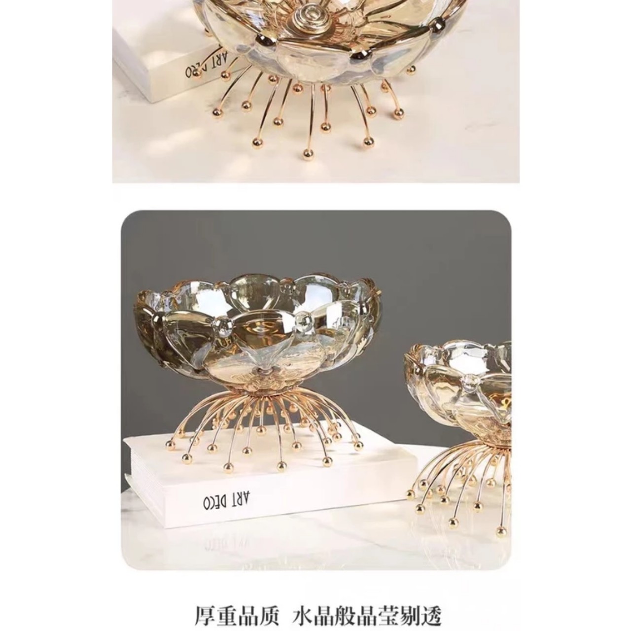 • Màu sắc: pha lê trong suốt,màu vàng sang trọng và hoa văn đa dạng bắt mắt. có chân bồng