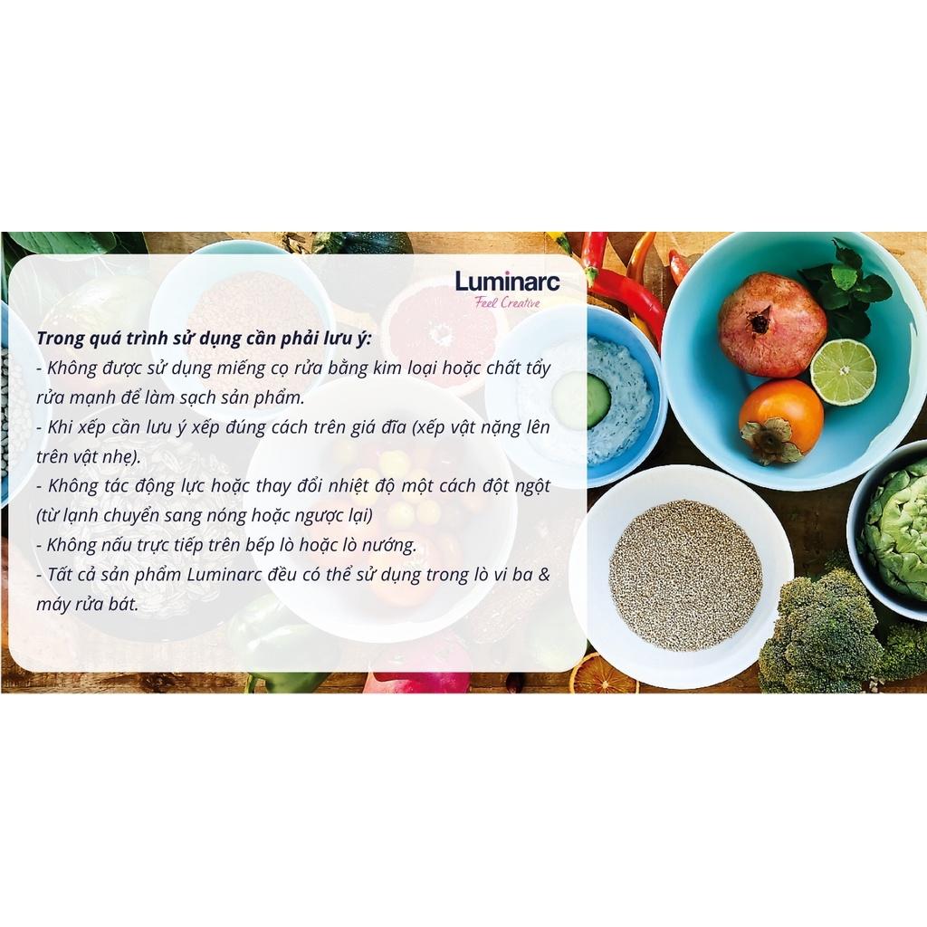 - Quy cách: 6 đĩa / bộ. - Kích thước: 25cm. - Chất liệu: Thuỷ tinh opal, cường lực, kháng vỡ. - Xuất xứ: Pháp. - Đặc tính nổi bật: cường lực, kháng vỡ nhiều