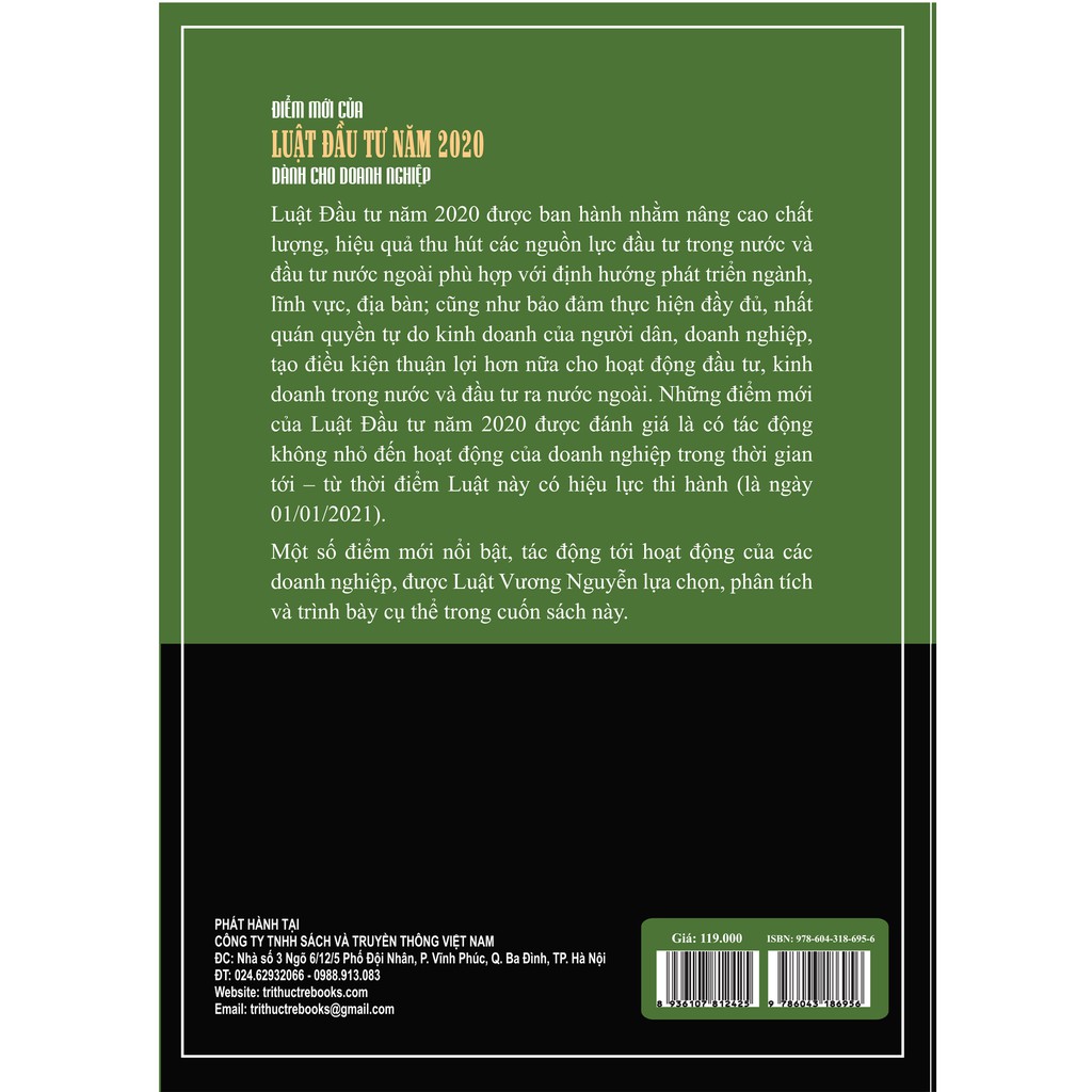 Hiểu rõ tầm quan trọng của Luật Đầu tư năm 2020 đối với các hoạt động đầu tư trên thị trường, nhóm tác giả đã thực hiện phân tích, đánh giá những điểm mới tiêu biểu của Luật Đầu tư năm 2020 và trân trọng giới thiệu đến bạn đọc cuốn sách: “Điểm mới của Luật Đầu tư năm 2020 dành cho doanh nghiệp”. Phần thứ nhất của cuốn sách mang đến cho bạn đọc những phân tích, đánh giá ngắn gọn về các điểm mới tiêu biểu của Luật Đầu tư năm 2020, kèm theo những lưu ý, lời khuyên chắt lọc, dễ ghi nhớ và cần thiết đối với mỗi doanh nghiệp. Phần thứ hai của cuốn sách là nội dung so sánh chi tiết hai văn bản: Luật Đầu tư năm 2014 và Luật Đầu tư năm 2020 được trình bày theo hình thức đối chiếu cụ thể từng điều luật, trong đó, nhấn mạnh từng chi tiết khác biệt để độc giả có thể dễ dàng theo dõi và áp dụng trên thực tế.