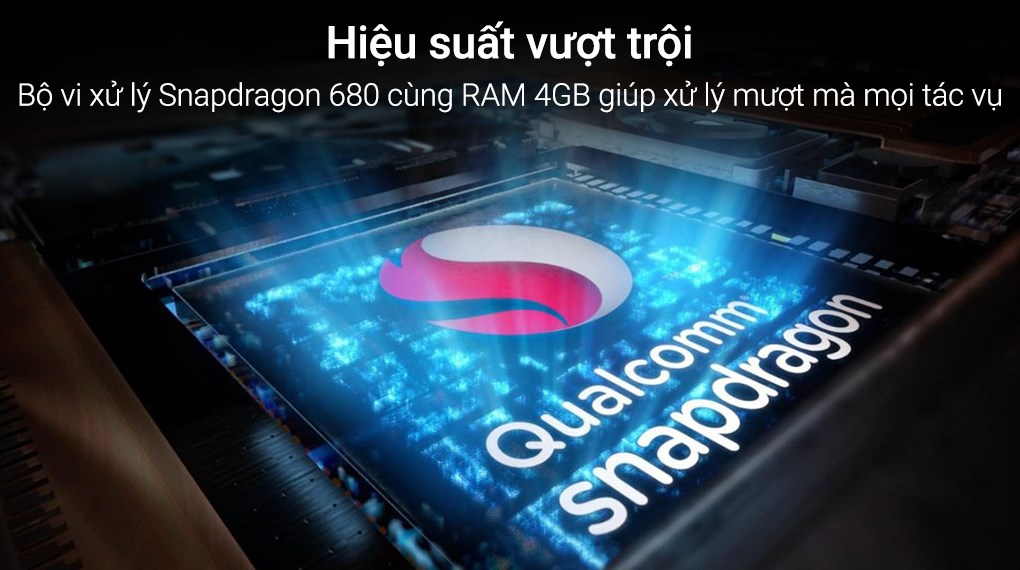 • Máy sở hữu con chip Snapdragon 680 giúp người dùng nâng tầm trải nghiệm hiệu năng tốt trong phân khúc mang tới khả năng xử lý mượt mà, ổn định, đáp ứng nhiều nhu cầu sử dụng khác nhau từ học tập đến giải trí, xem phim, lướt mạng xã hội hay các tựa game phổ biến.