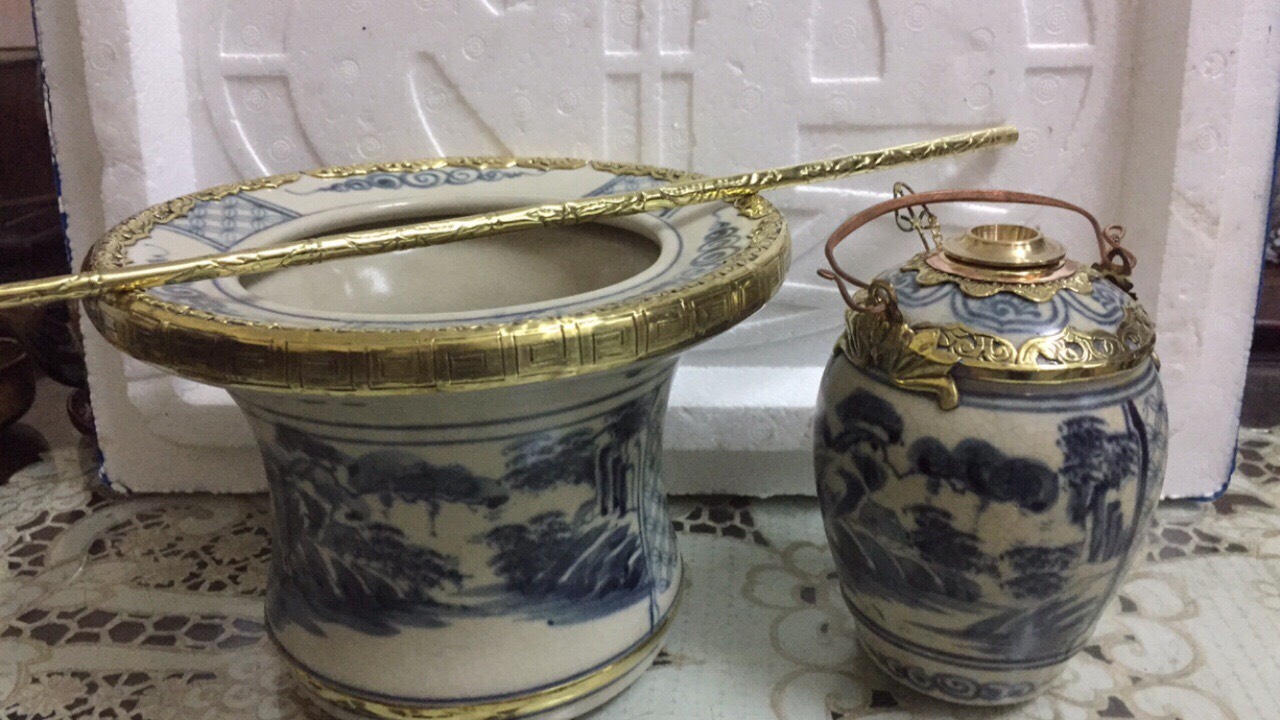 Điếu bát men rạn bọc đồng vẽ Sơn Thủy dáng cao chính hãng gốm sứ Bát Tràng - Điếu bát men rạn bọc đồng cao cấp, kiểu dáng độc đáo, được đúc bằng đồng nguyên