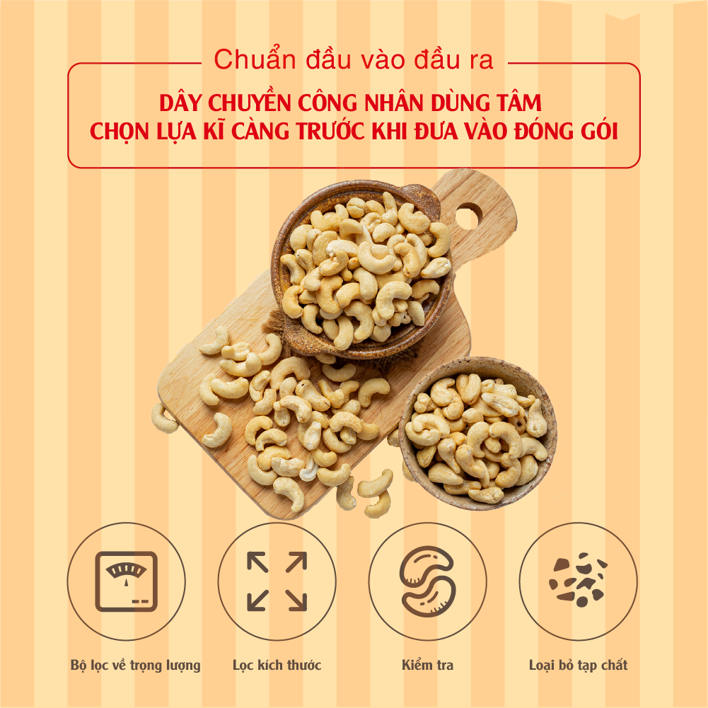 THÔNG TIN SẢN PHẨM HẠT ĐIỀU RANG MUỐI - Khối lượng: 140g. - Thành phần: Hạt điều, muối. - Xuất xứ: Việt Nam. - NSX và HSD: Xem trên bao bì. Lưu ý: Không sử