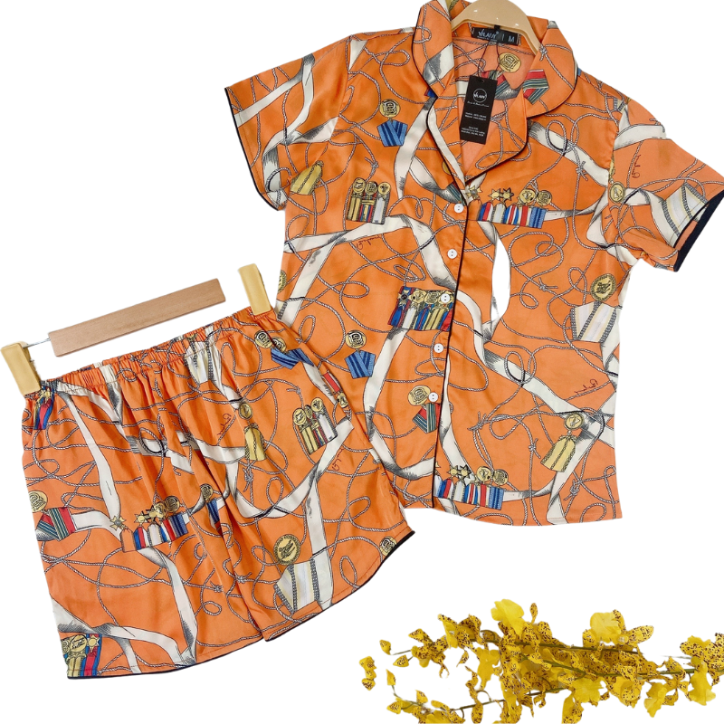 Đồ bộ Pyjama lụa, đồ mặc nhà nữ VILADY - B134 kiểu quần đùi tay cộc, họa tiết siêu dễ thương, chất liệu lụa Pháp ( lụa latin) - Màu cam