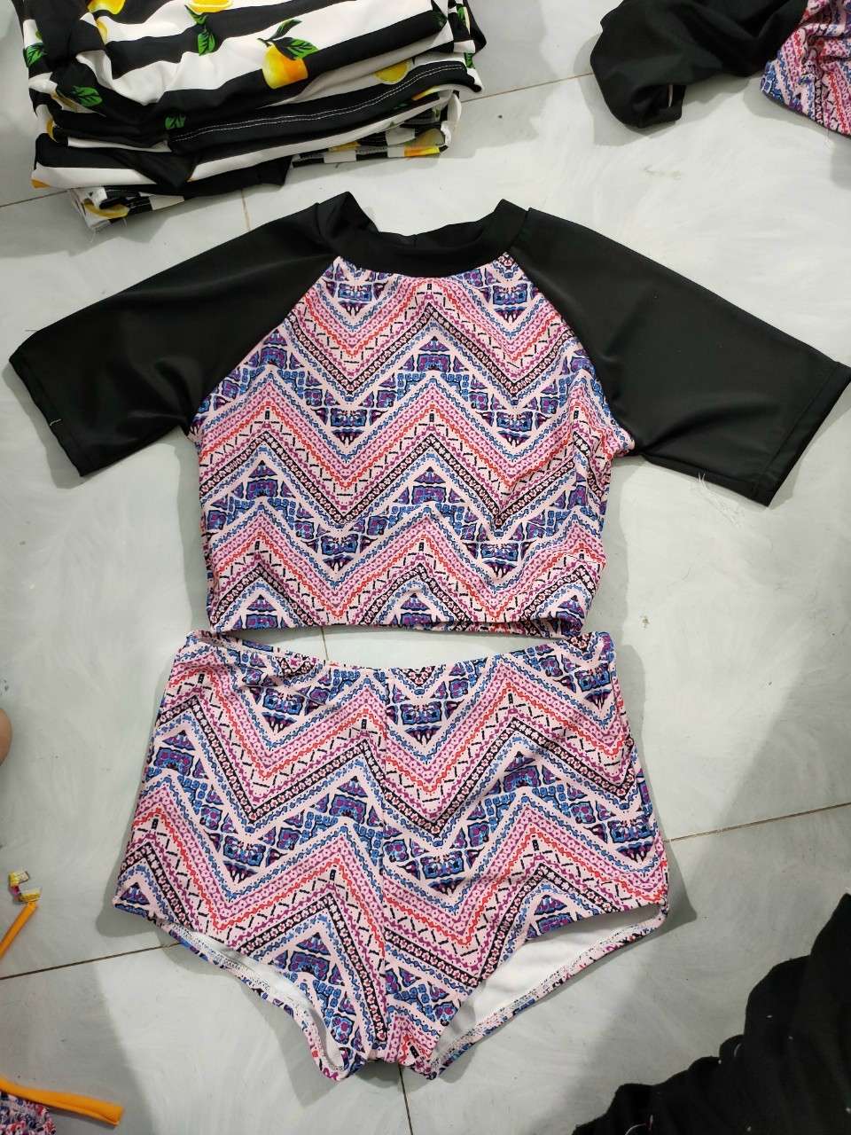 - Mẫu đồ bơi mới nhất cho các bạn nữ thích sự trẻ trung kín đáo mà vẫn thu hút khi đi biển, đi bơi. - Áo dáng ngắn tay phối hoạ tiết trẻ khoẻ,