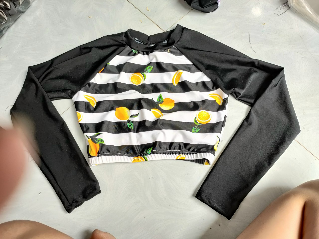 Set Đồ Bơi Nữ Rời Đùi Dài Tay Đi Biển Đi Bơi Chất liệu Polyester 95%, mật độ dệt vừa Áo có sẵn lớp đệm, hông áo có thể rút lên làm croptop cá tính