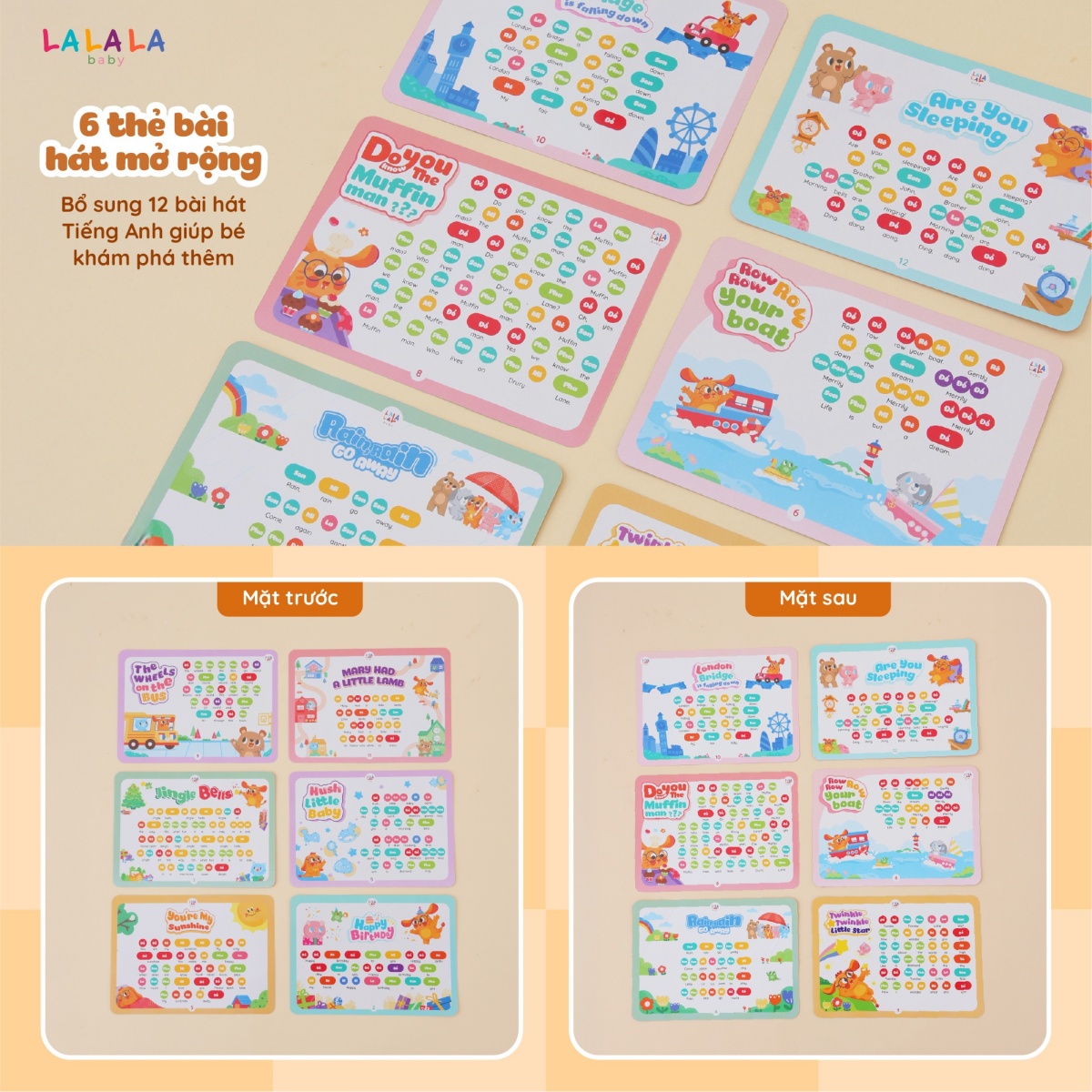 - 6 thẻ bài hát rời 2 mặt 14,8x21cm, in sẵn 12 bài nhạc khác để bé luyện tập thêm
