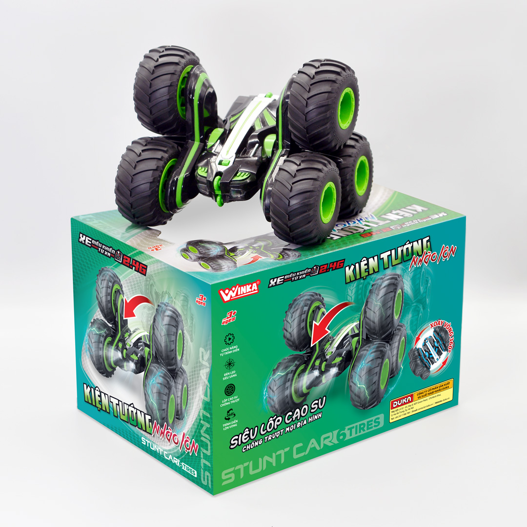 XE ĐIỀU KHIỂN TỪ XA 2.4G - KIỆN TƯỚNG NHÀO LỘN Đồ chơi xe điều khiển được thiết kế với mô hình xe đua, chất liệu hợp kim độ bền cao, lốp cao su to và