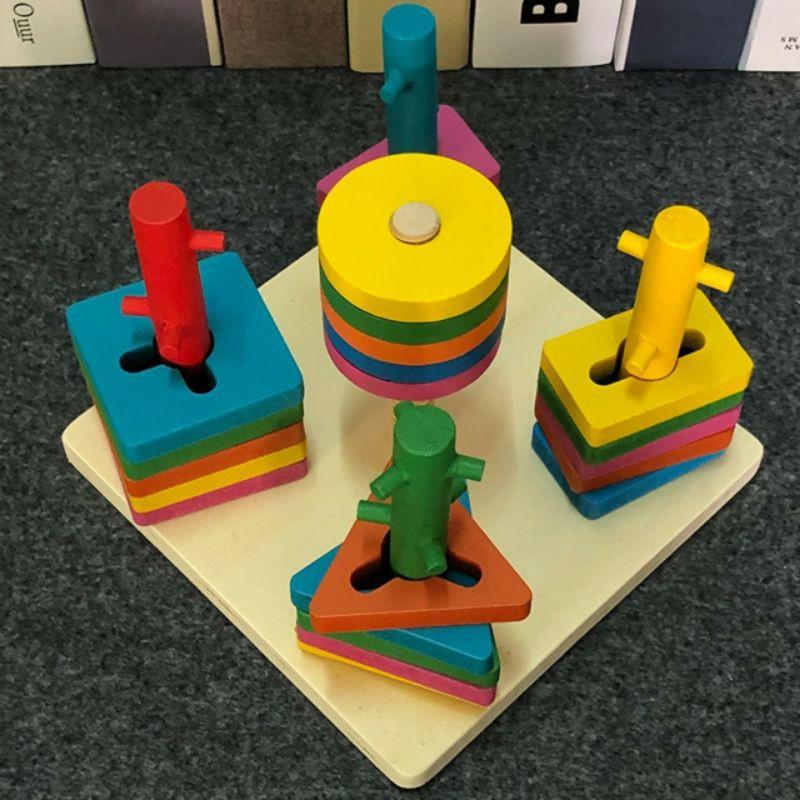 - Bộ đồ chơi xếp hình 5 trụ cột bằng gỗ giúp bé linh hoạt xử lí giữa tay , mắt và bộ não nhờ các trở ngại trên mỗi trụ cột.