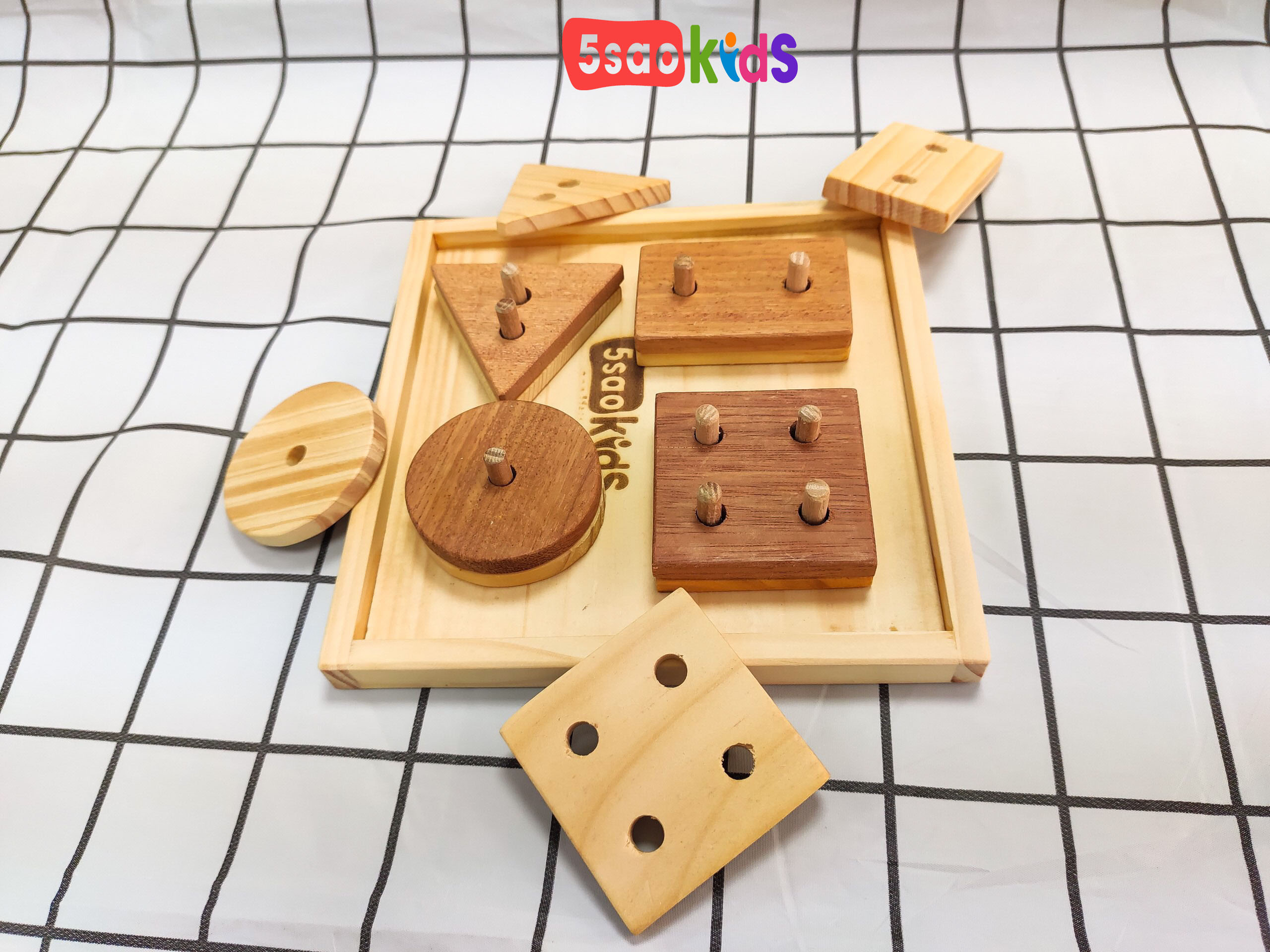 MÔ TẢ SẢN PHẨM Chất liệu: 100% gỗ tự nhiên, được mài mịn, bo tròn góc cạnh đảm bảo an toàn cho bé Sản phẩm khối hình học cho trẻ phát huy sức sáng tạo, tiếp cận toán học Kích thước 14 x 15 cm Hình học: Hình vuông 4 lỗ, hình tam giác 3 lỗ, hình chữ nhật 2 lỗ, hình tròn 1 lỗ Phù hợp cho bé từ 1 tuổi trở lên. Thương hiệu: 5saokids