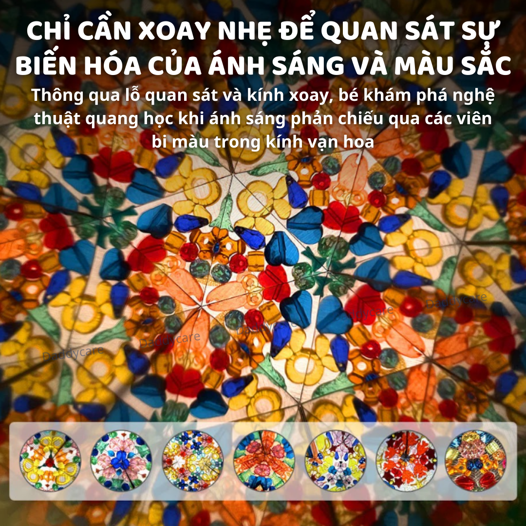 - CHỈ CẦN XOAY NHẸ ĐỂ QUAN SÁT SỰ BIẾN HÓA VI DIỆU CỦA ÁNH SÁNG VÀ MÀU SẮC Thông qua lỗ quan sát và kính xoay, bé được khám phá nghệ thuật quang học kỳ diệu khi ánh sáng phản chiếu qua các viên bi màu sắc trong kính vạn hoa,