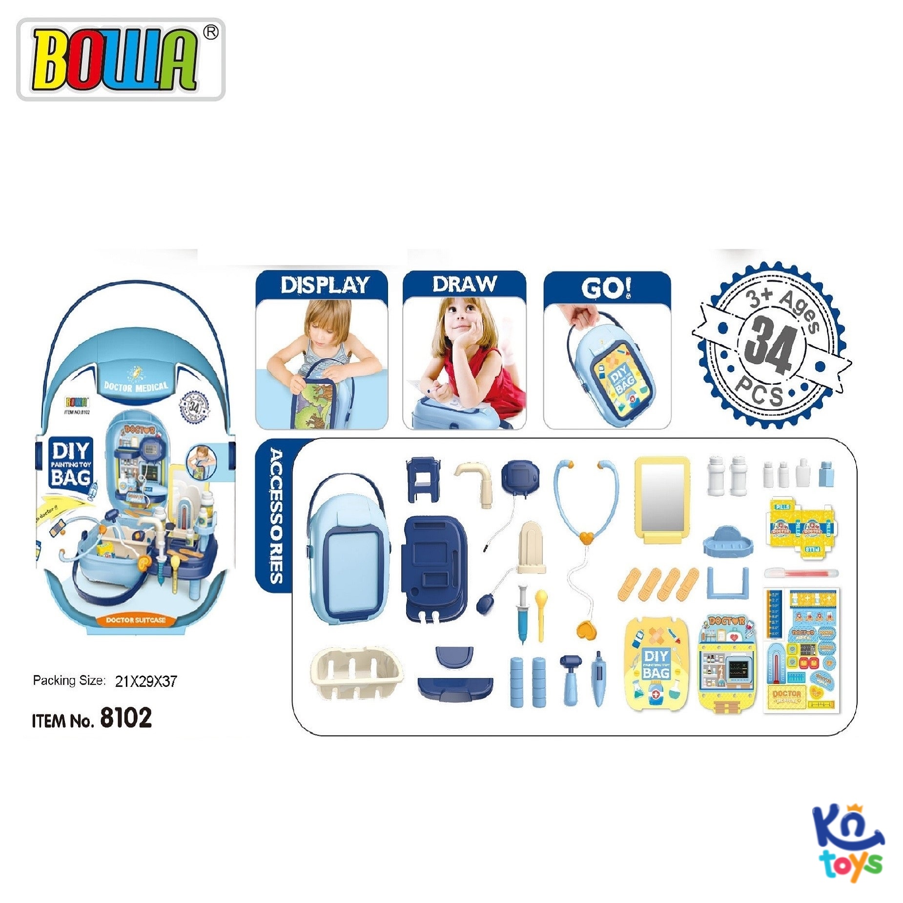 - Bộ sản phẩm BOWA 8102 - Bộ bác sĩ gồm 34 chi tiết với trò chơi bác sĩ có các dụng cụ bác sĩ như tai nghe, ống t iêm… giúp bé nhập vai bác sĩ một cách đầy thú vị. Đặc biệt thiết kế hộp đựng có quai xách tay vô cùng tiện lợi, giúp bé có thể mang đi đến bất cứ nơi đâu.