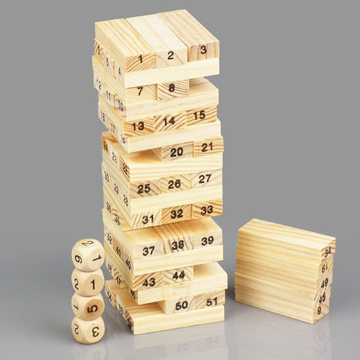 Bộ đồ chơi rút gỗ trẻ em cao cấp gồm 54 miếng gỗ hình chữ nhật in số từ 1- 54 ở hai đầu và 04 hột xúc xắc 6 mặt (xí ngầu) có in các chữ số từ 1-6.
