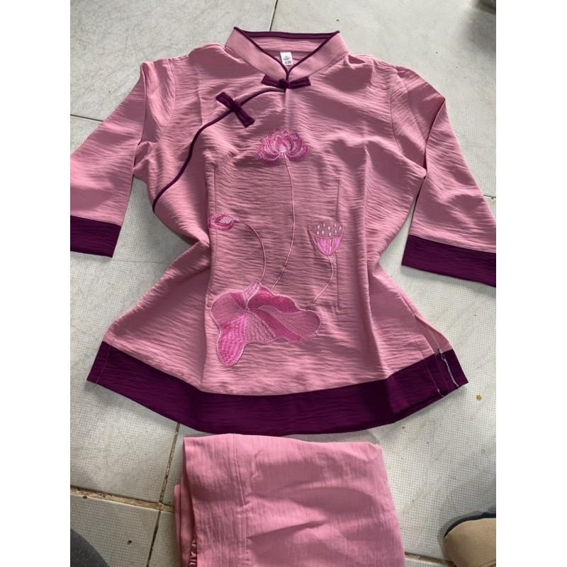 Đồ bộ đi chùa vải đủi vân may thêu hoa sen và chữ AN
