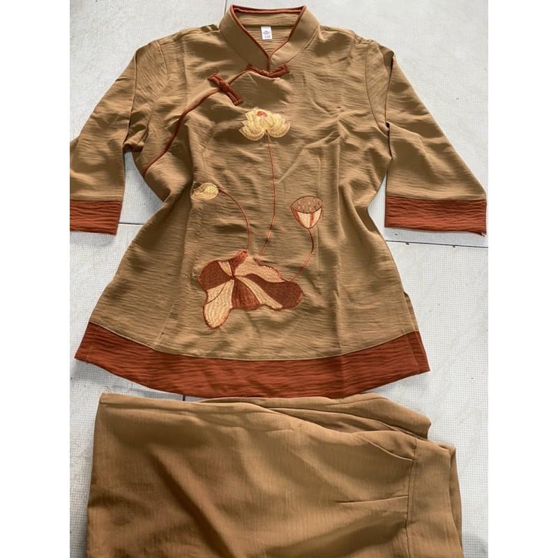 SIÊU PHẨM pháp phục nữ vải đũi lụa thêu sen cao cấp - quần áo lam đi lễ chùa chính hãng SEN HỒNG