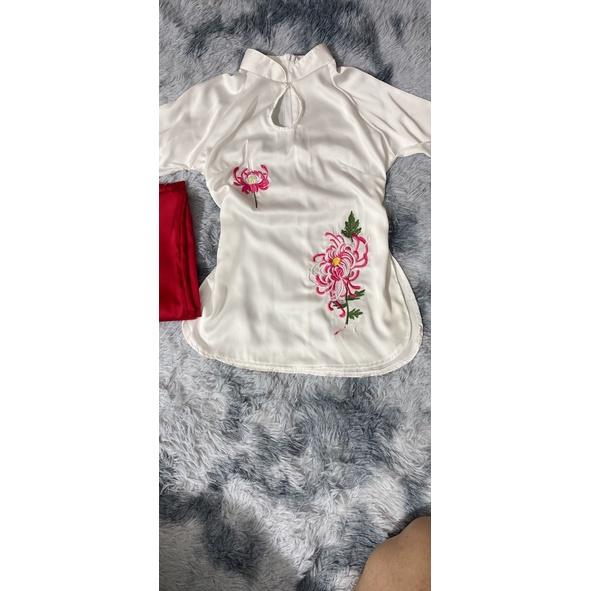 đồ lam đi chùa nữ thêu hoa Cúc cổ V vải đũi thái, Pháp phục lễ chùa, hoa bỉ ngạn