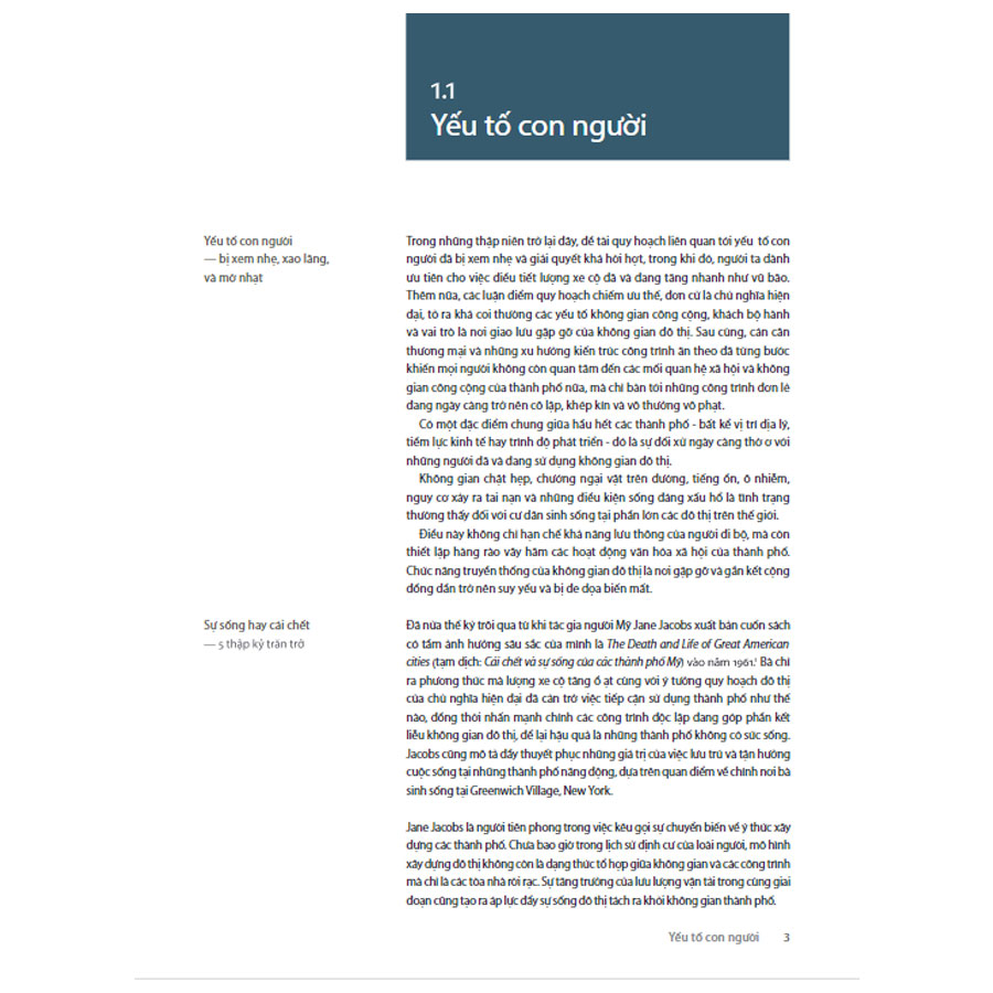 Các thành phố - như những cuốn sách - đều có thể “đọc”, và Jan Gehl hiểu được ngôn ngữ của chúng. Phố phường, đường dạo , quảng trường, và công viên là cú pháp của đô thị; chúng cung cấp cấu trúc để vận hành sự sống cho các thành phố, khuyến khích và hỗ trợ những hoạt động đa dạng, từ yên tĩnh, suy tư cho đến ồn ào, náo nhiệt. Một thành phố nhân văn - với những đường phố, quảng trường, công viên được thiết kế kỹ lưỡng - tạo ra niềm vui thích cho du khách và người qua đường, cũng như cả những con người sinh sống, làm việc và vui chơi giải trí hàng ngày ở đó.