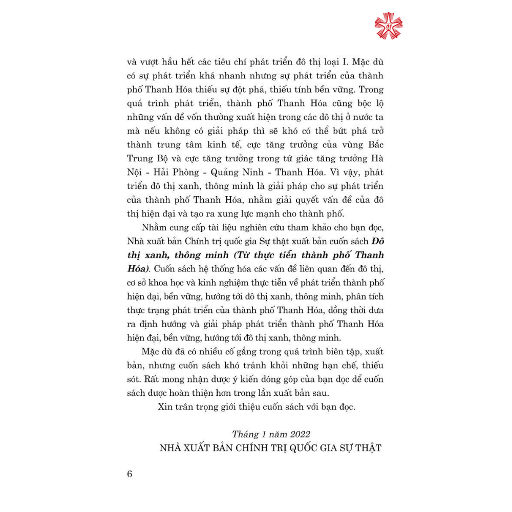 Cuốn sách Đô thị xanh, thông minh (từ thực tiễn thành phố Thanh Hóa), góp phần cung cấp tài liệu tham khảo cho bạn đọc tìm hiểu về vấn đề xây dựng đô thị xanh, thông minh từ thực tiễn thành phố Thanh Hóa. Nội dung cuốn sách hệ thống hóa các vấn đề liên quan đến đô thị, cơ sở khoa học và kinh nghiệm thực tiễn về phát triển thành phố hiện đại, bền vững, hướng tới đô thị xanh, thông minh, phân tích thực trạng phát triển của thành phố Thanh Hóa, đồng thời đưa ra định hướng và giải pháp phát triển thành phố Thanh Hóa hiện đại, bền vững, hướng tới đô thị xanh, thông minh.
