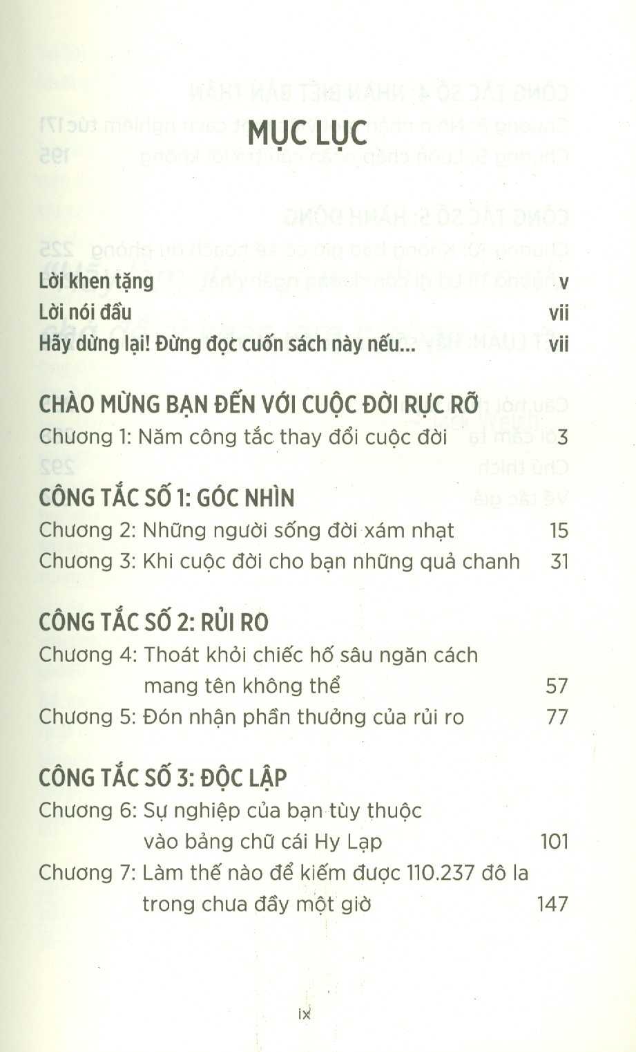 Điều gì tạo nên sự khác biệt giữa một người bình thường và những con người vĩ đại? Đó có phải là sự may mắn, xuất thân hay tài năng thiên bẩm? Trong cuốn sách này, tác giả đã chứng minh rằng bạn không cần có những điều trên để thành công. Mỗi người đều mang trong mình một sự vĩ đại, hay nói cách khác là bản thể tốt nhất của mình, và nó vẫn đang say ngủ. Để đánh thức sự vĩ đại trong mình, điều cần làm là bật lên "năm chiếc công tắc nội tại". Và việc của bạn là lựa chọn, lựa chọn bật lên năm chiếc công tắc ấy và lựa chọn sống Cuộc đời Xám nhạt hay Cuộc đời Rực rỡ.