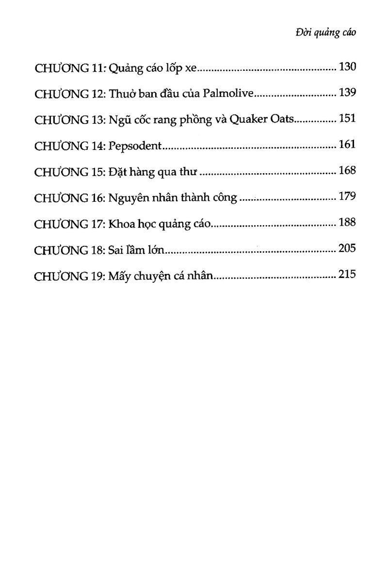 Palmolive khởi đầu chỉ với 700 USD quảng cáo thử nghiệm. Giờ đây nó là một phần của Colgate-Palmolive nổi tiếng toàn cầu. Pepsodent được sinh ra trong những đêm buồn tại một dự án thủy lợi ở Arizona. Giờ nó là một trong những nhãn hàng số một của Unilever. Goodyear đã từng chỉ dám chi 40 nghìn USD cho quảng cáo mỗi năm vì chả ai tin là có người quan tâm đến lốp xe. Giờ nó là công ty lốp xe ai ai cũng biết. Hopkins khởi đầu chỉ có 100 USD trong tay. Vào cuối đời, ông là một trong những cây đại thụ của ngành quảng cáo. Bạn thực sự không muốn nghe câu chuyện về họ sao?