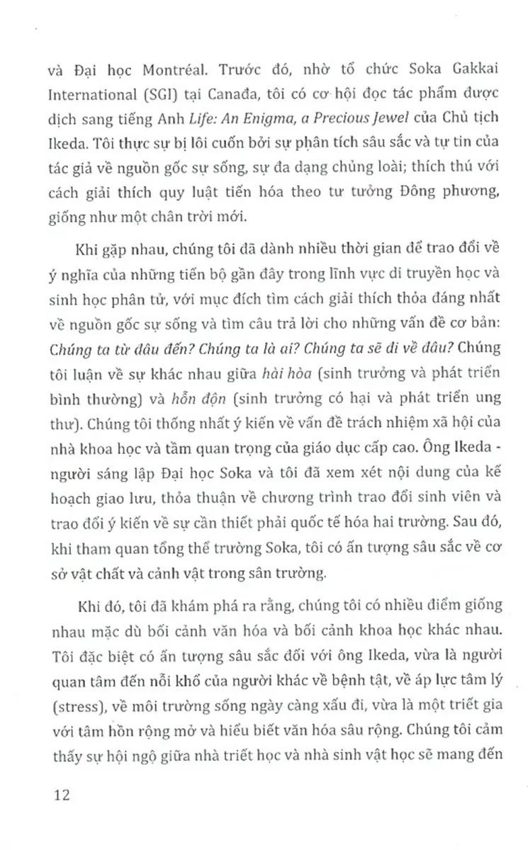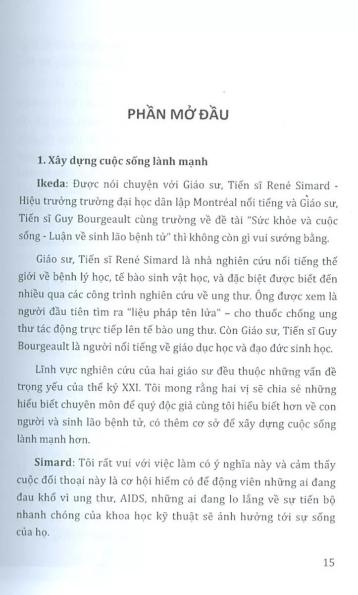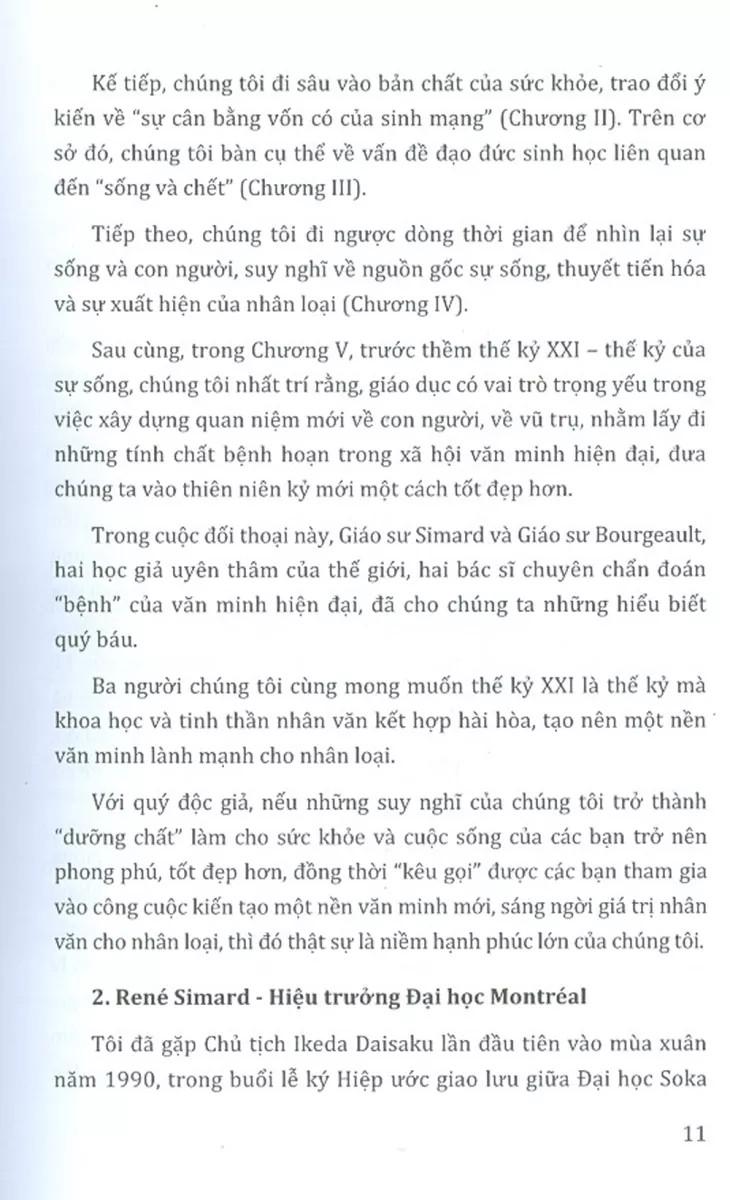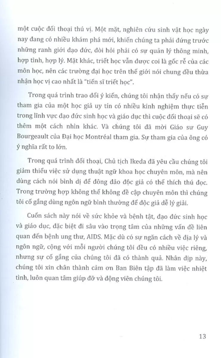 Cuốn sách được trình bày dưới hình thức một cuộc đối thoại, trao đổi cởi mở và đầy trách nhiệm giữa ba chuyên gia uy tín ở ba lĩnh vực chuyên môn khác nhau. Họ đã vượt qua rào cản về ngôn ngữ và những đặc thù của bối cảnh văn hóa, khoa học để cùng nhau thảo luận những vấn đề lớn mà nhân loại ngày nay đã và đang phải đối mặt như ung thư, HIV/AIDS, thụ tinh nhân tạo, bệnh trạng của văn minh vật chất, Thông qua cuộc đối thoại này, ba chuyên gia còn chia sẻ những kiến thức, những giải pháp và những hiểu biết sâu rộng về sức khỏe và bệnh tật, giáo dục nhân sinh quan cũng như triết lí riêng của họ về ý nghĩa cuộc sống; đồng thời khám phá những vấn đề về đạo đức và những tác động của nó đối với con người; từ đó mong muốn hướng tới một tương lai văn minh, lành mạnh cho nhân loại, nơi mà khoa học, tâm linh và tinh thần nhân văn được kết hợp một cách hài hòa.