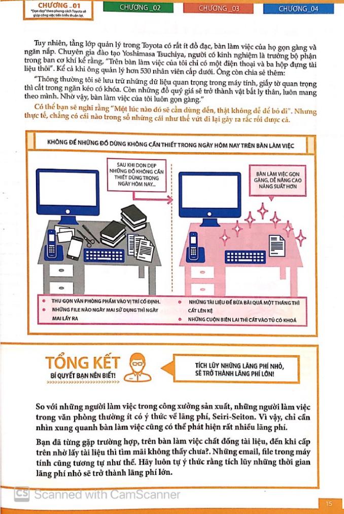 Phương thức sản xuất Toyota được tượng trưng bởi những khái niệm như Just In Time, Kanban, Kaizen. Phương thức này đã quá nổi tiếng khi chúng ta nhắc tới cái tên Toyota. Ở đâu đó vẫn có những suy nghĩ như “văn phòng của chúng tôi không thể bắt chước cách làm nơi công xưởng của Toyota được” hay “một số cá nhân có áp dụng đi chăng nữa thì cũng chẳng có ý nghĩa gì trong tổ chức”. Những suy nghĩ này là những điều ngộ nhận. Just In Time hay Kanban đúng là không phải cách làm mà ai cũng có thể bắt chước ngay được, nhưng dọn dẹp thì dù công ty nhỏ tới mấy, dù bạn làm việc gì đi chăng nữa thì đều có thể áp dụng ngay lập tức. Dọn dẹp theo phương thức Toyota không cần tới một hệ thống lớn, cũng không cần tiêu tốn nhiều kinh phí.