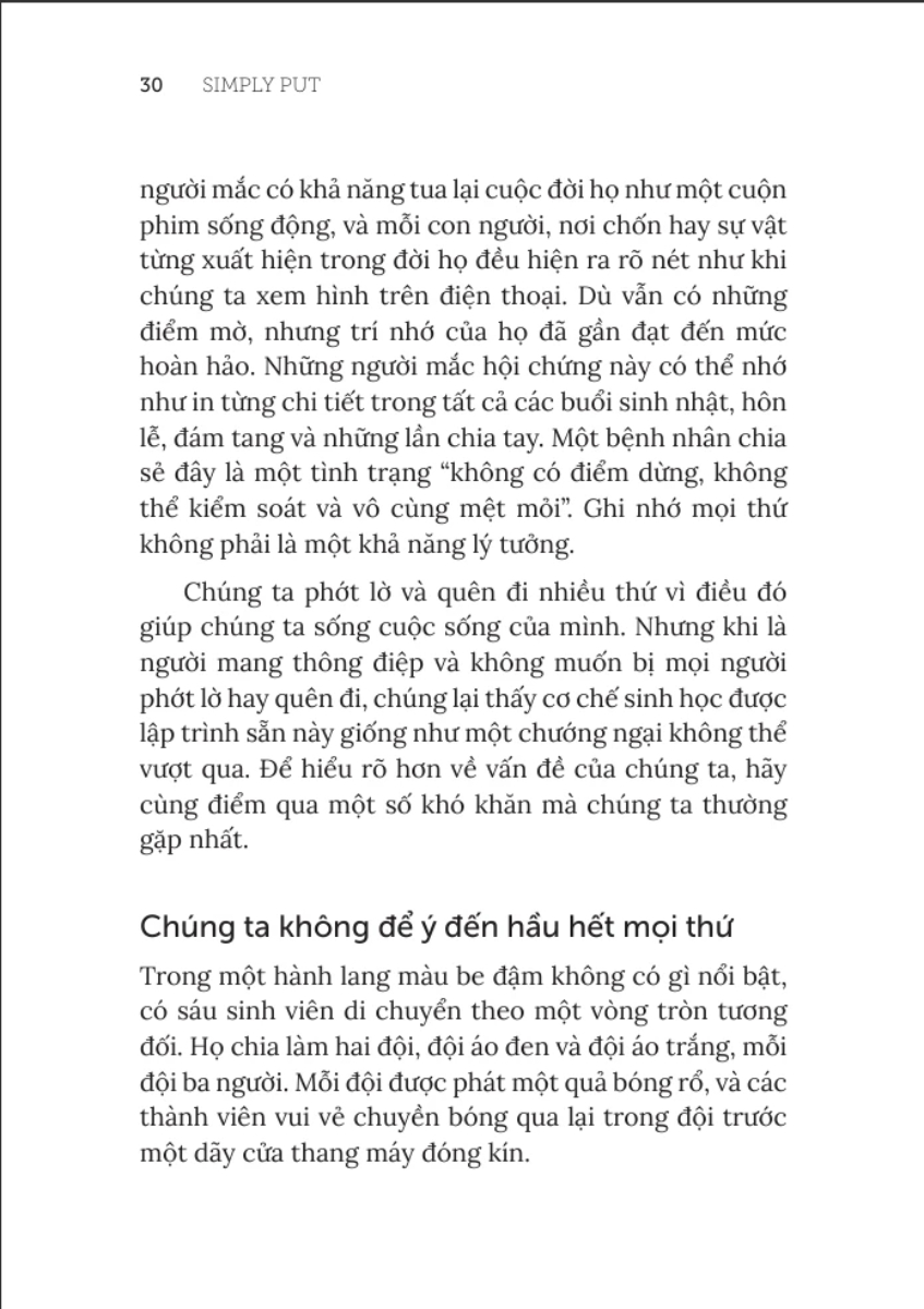 Trong một thế giới không ngừng “dội bom” chúng ta với hàng triệu thông tin mỗi ngày, sự đơn giản chính là chìa khóa để thông điệp của bạn không bị hòa lẫn trong ma trận đó. Mở đầu cuốn sách, Guttmann chia sẻ một số kiến thức cơ bản để giúp chúng ta hiểu rằng bộ não con người rất dễ bị quá tải khi đón nhận nhiều thông tin và yếu tố kích thích. Những thông điệp phức tạp không chỉ khó kết nối với não bộ mà còn thường khiến bộ não bối rối, áp lực và kém tập trung. Ngược lại, thông điệp đơn giản sẽ nổi bật vì chúng dễ hiểu, dễ nhớ và dễ phản ứng.