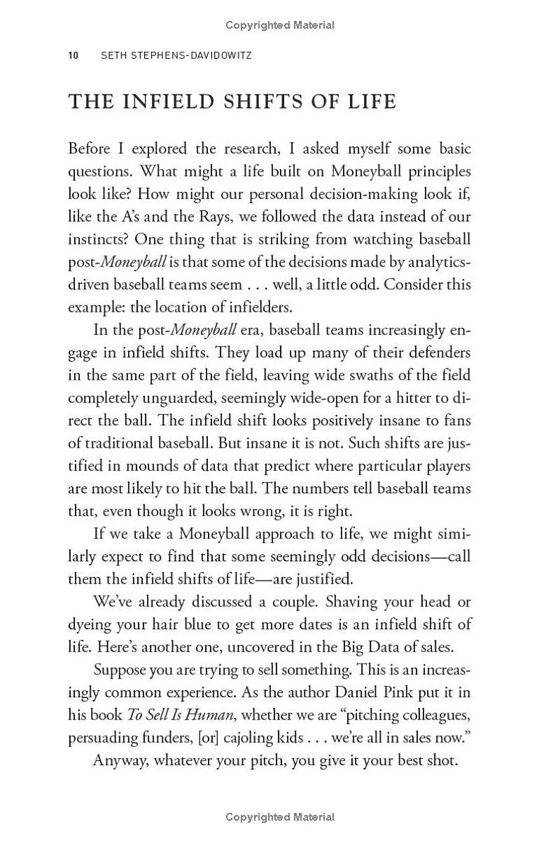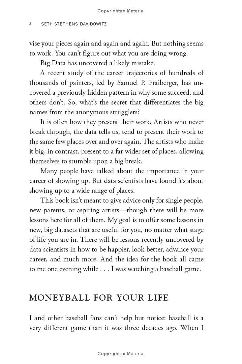 Telling fascinating, unexpected stories with these numbers and the latest big data research, Stephens-Davidowitz exposes that, while we often think we know how to better ourselves, the numbers disagree. Hard facts and figures consistently contradict our instincts and demonstrate self-help that actually works—whether it involves the best time in life to start a business or how happy it actually makes us to skip a friend’s birthday party for a night of Netflix on the couch. From the boring careers that produce the most wealth, to the old-school, data-backed relationship advice so well-worn it’s become a literal joke, he unearths the startling conclusions that the right data can teach us about who we are and what will make our lives better.
