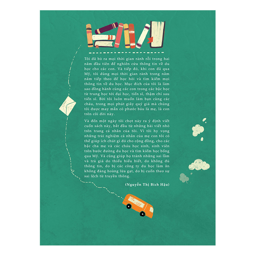 Và đến một ngày tôi chợt nảy ra ý định viết cuốn sách này, bắt đầu từ những bài viết nhỏ trên trang cá nhân của tôi. Vì tôi hy vọng những trải nghiệm cá nhân của mẹ con tôi có thể giúp ích chút gì đó cho cộng đồng, cho các bậc cha mẹ và các cháu học sinh, sinh viên trên bưóc đường du học và tìm kiếm học bổng qua Mỹ. Và cũng giúp họ tránh những sai lầm và trả giá do thiếu hiểu biết, do không đủ thông tin, do bị các công ty du học làm ăn không đàng hoàng lừa gạt, do bị cuốn theo sự sai lệch từ truyền thông." (Nguyễn Thị Bích Hậu)