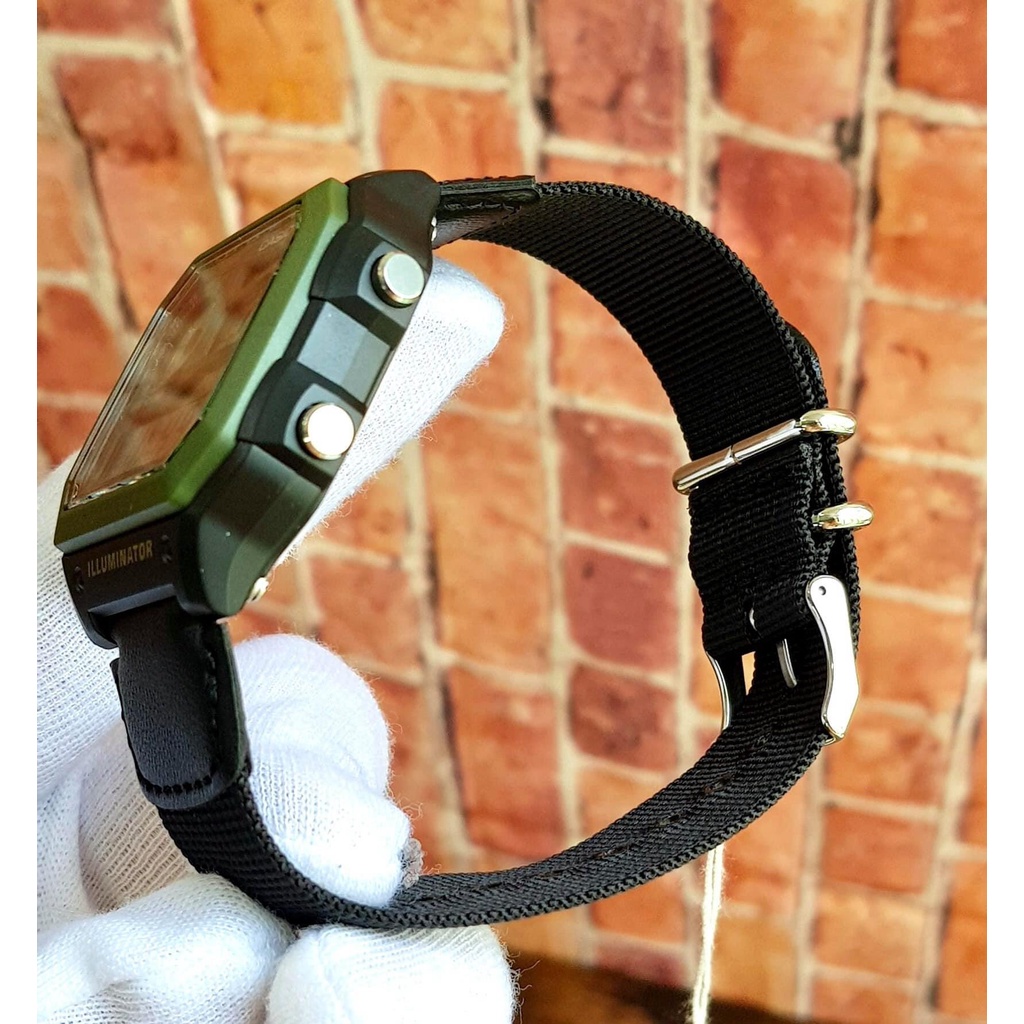 Đồng hồ nam Casio AE-1200WHB-1BVDF có thiết kế mạnh mẽ và cá tính. Vỏ máy có tông màu xanh lục chủ đạo, kết hợp với viền bên ngoài màu đen tinh tế. Điểm nhấn đặc biệt là bộ dây đeo bằng vải, tạo nên phong cách đậm chất cá tính
