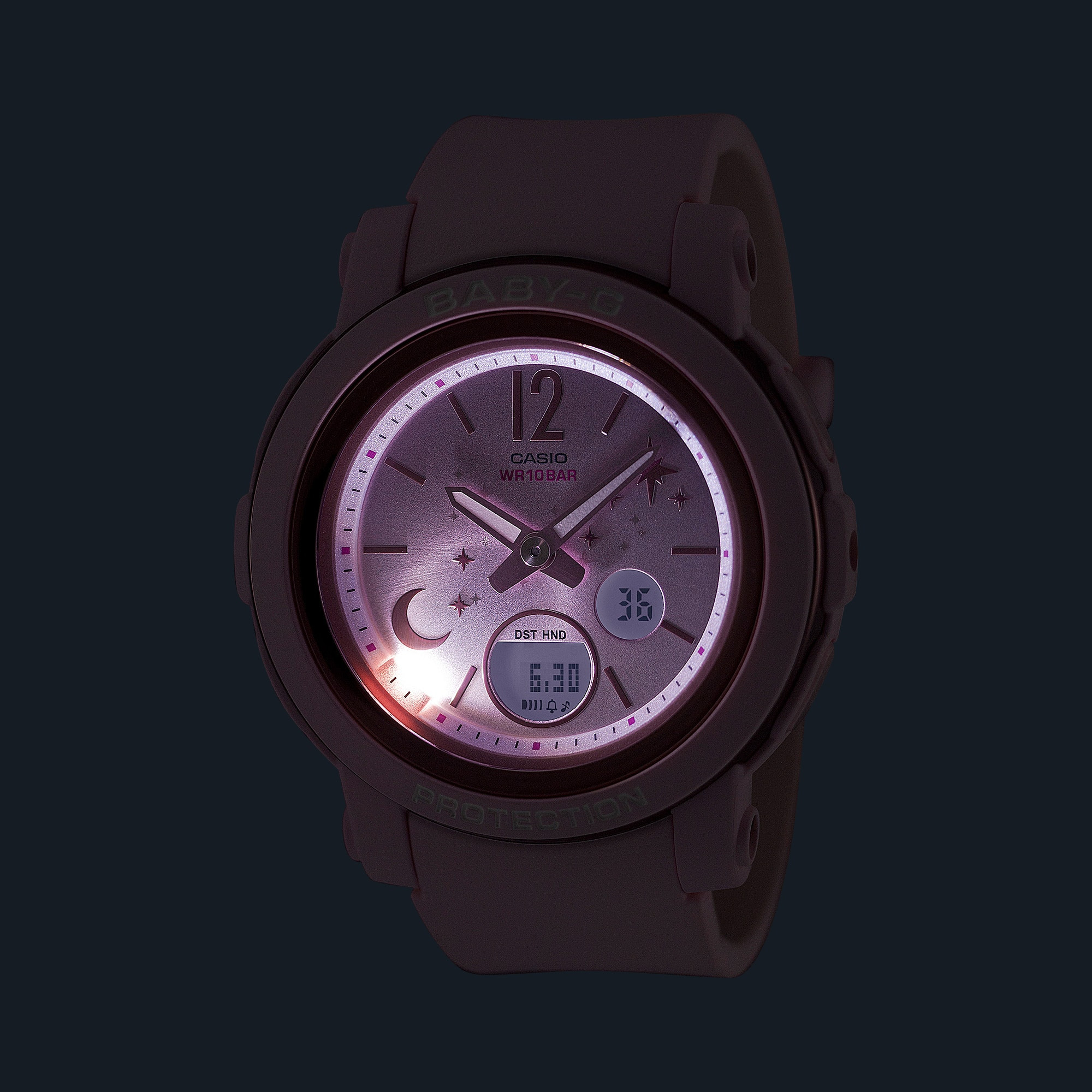 Thỏa mãn vị giác với mẫu đồng hồ BABY-G màu kẹo. Vỏ và dây đeo đẹp mắt phủ lớp hoàn thiện mờ kết hợp với đường gờ và vạch chỉ giờ bằng nhựa resin trong