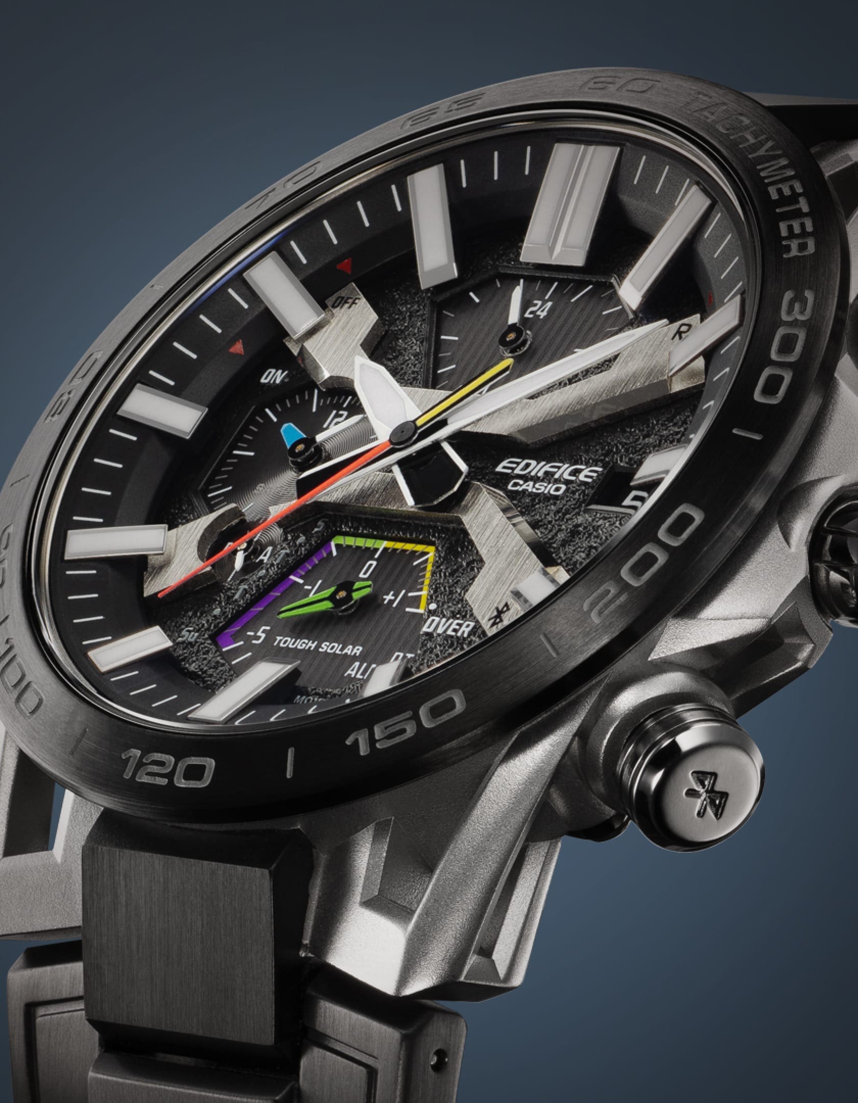 Các tính năng Đồng hồ ghi thời gian chạy bằng năng lượng mặt trời mới này có mặt số sợi carbon tượng trưng cho chủ đề đua xe thể thao của dòng sản phẩm EDIFICE.