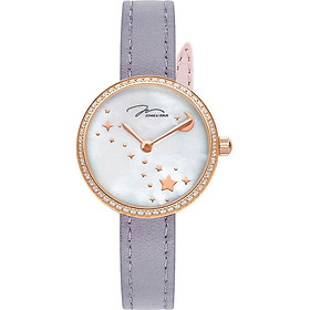 Mặt đồng hồ nữ thiết kế dạng tròn trẻ trung, bên trên được đính đá Swarovski lấp lánh nổi bật. Đồng hồ có 2 kim được mạ màu vàng giúp người đeo quan sát thuận tiện hơn, bên trong mặt đồng hồ được trang trí hình Trăng và Sao trên nền xà cừ trắng trông rất trẻ trung, nổi bật.