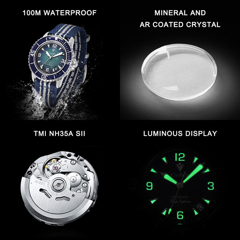 Mua tại TiktokThương Hiệu CADISEN Quốc gia đăng ký thương hiệu Nhật Bản Kiểu máy Nhật Bản (Japan Movt) Mã sản phẩm C8239M2 Giới tính Nam Loại sản phẩm Đồng hồ cơ (Automatic) Đường kính mặt 42 mm Chiều dày 12.5 mm Chất liệu vỏ Thép không gỉ 316L Chất liệu dây Dây dù cao cấp Chất liệu mặt kính Sapphire Độ chịu nước 10 ATM Bảo hành 24 tháng